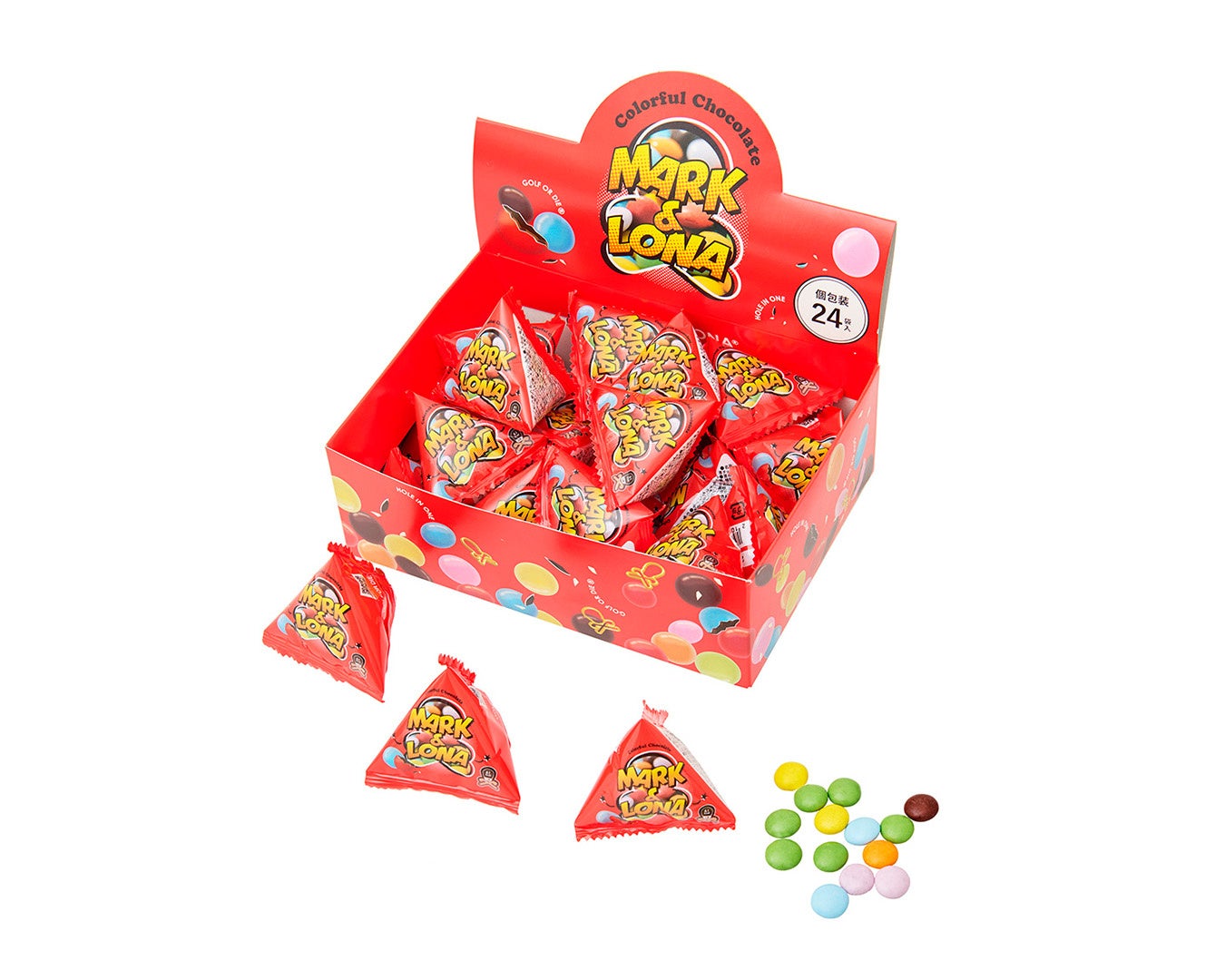 常温で溶けにくいシュガーコーティングが施されたカラフルなミルクチョコレートは、キャッチーなオリジナルロゴをあしらったテトラ型の個包装で、ラウンド中の栄養補給や気分転換にぴったりです。持ち運びやすいサイズ感で、プチギフトとしてもおすすめです。