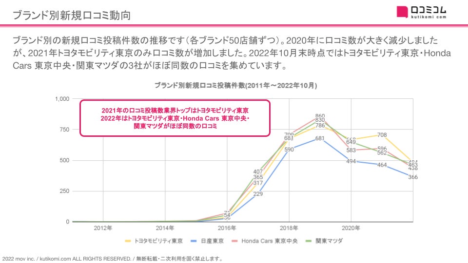 ・2022年10月末時点ではHonda Cars 東京中央、トヨタモビリティ東京、日産東京、関東マツダの3社がほぼ同数の口コミを集めており、日産東京は口コミ投稿数が比較的少ないこと