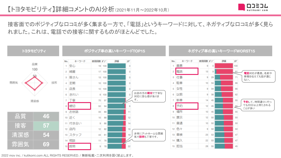 それらのAI解析を用いた分析例として「トヨタモビリティ東京」のQSCA・頻出ポジネガキーワードを確認しました。
