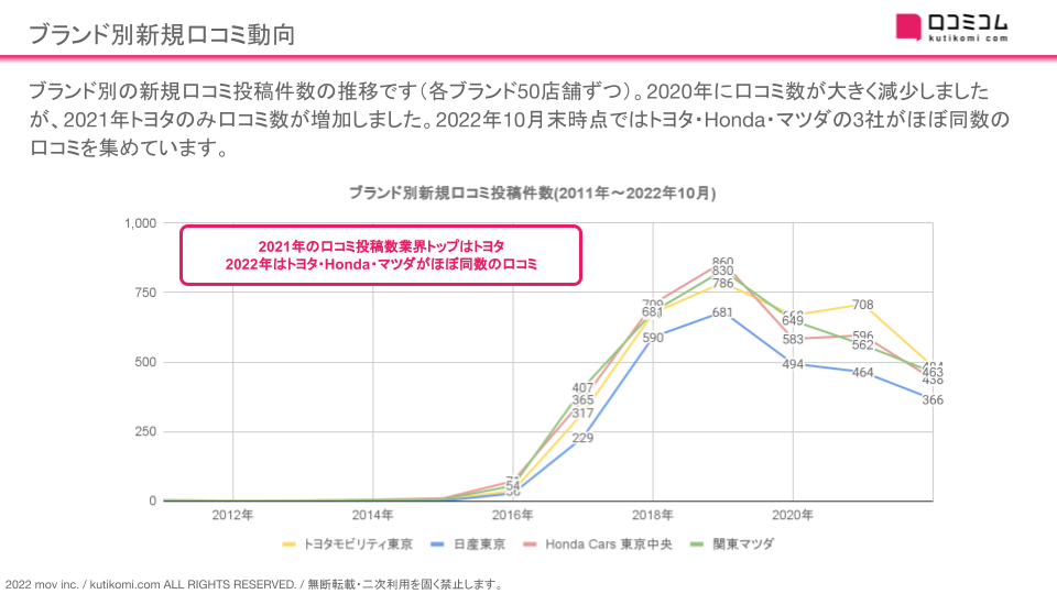 ブランド別の新規口コミ投稿件数の推移です(各ブランド50店舗ずつ)。2020年に口コミ数が大きく減少しましたが、2021年トヨタモビリティ東京のみ口コミ数が増加しました。2022年10月末時点ではトヨタモビリティ東京・Honda Cars 東京中央・関東マツダの3社がほぼ同数の口コミを集めています。