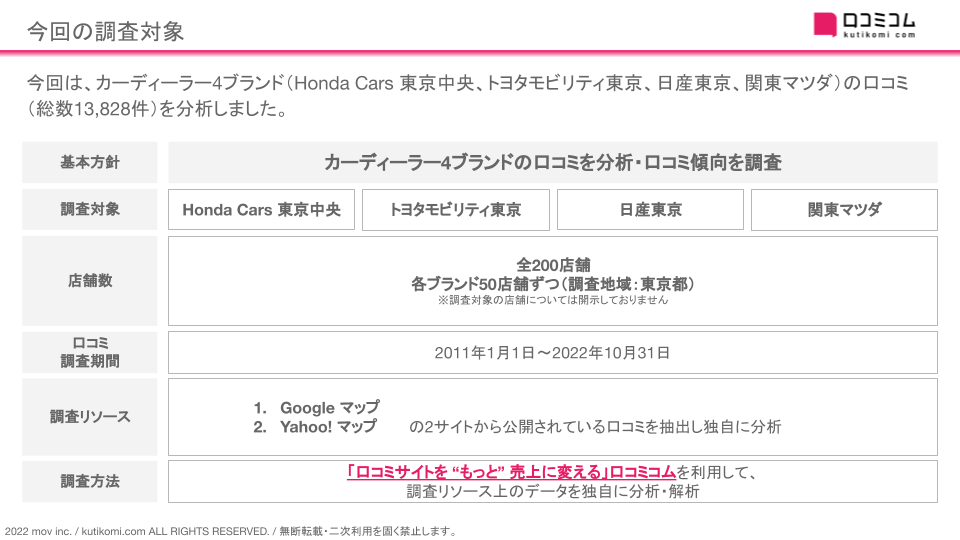 今回はカーディーラー4ブランド(Honda Cars 東京中央、トヨタモビリティ東京、日産東京、関東マツダ)50店舗ずつ合計200店舗に寄せられた13,828件の口コミを調査し、カーディーラー4ブランドの比較検証を行いました。