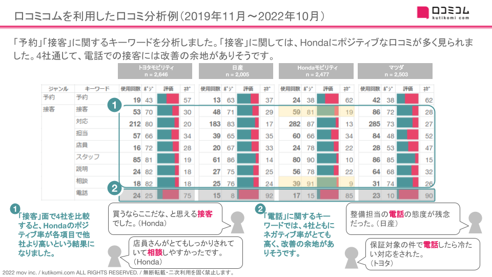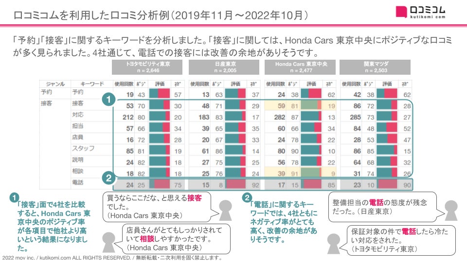 「予約」「接客」に関するキーワードを分析しました。「接客」に関しては、Hondaにポジティブな口コミが多く見られました。4社通じて、電話での接客には改善の余地がありそうです。