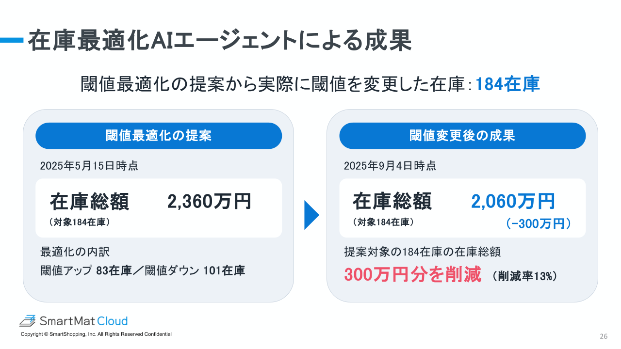 先行導入した株式会社MARUWA SHOMEIでは、2025年5月15日から9月4日の約4か月間で、対象184在庫において在庫総額を2,360万円から2,060万円へと約13%(300万円)削減する成果を実現しています。欠品リスクを抑えながら在庫を圧縮できた点が特徴です。