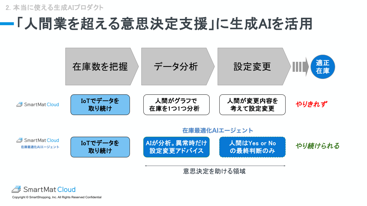 エスマットはこの「人間技ではやりきれない意思決定」の部分にこそ生成AIを使うべきだと考え、「在庫最適化AIエージェント」を開発しました。