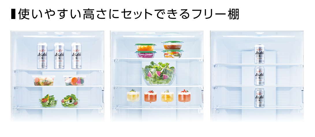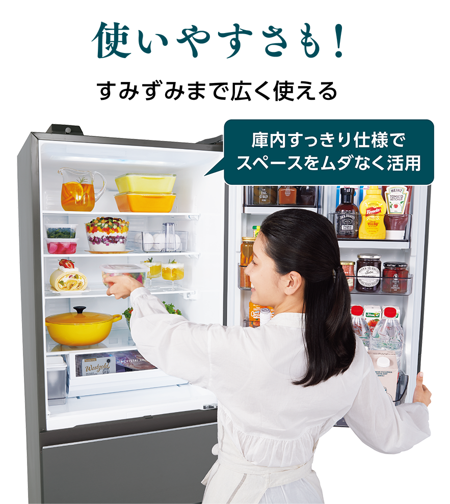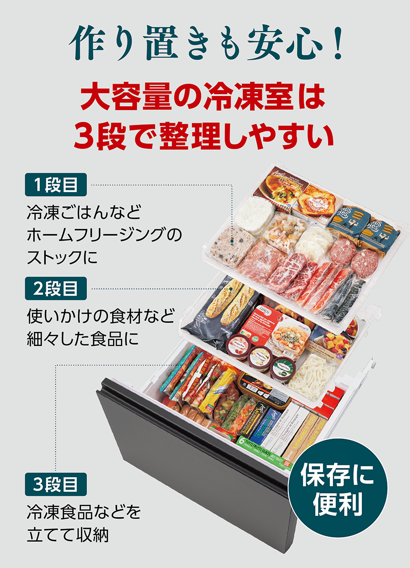 また、食生活の変化に合わせ庫内の容量配分を見直し、冷凍室の容量を拡大。整理整頓がしやすい3段容器を採用し、ストック食品やホームフリージング、使いかけの冷凍食品など食品の大きさに合わせ上手に収納することが可能になりました。