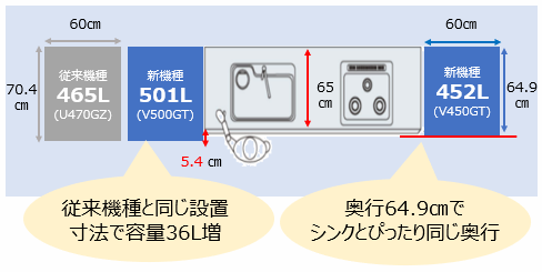 1. 置き場所そのままで36L増量した大容量タイプと、同等容量で奥行64.9cmとした薄型タイプ