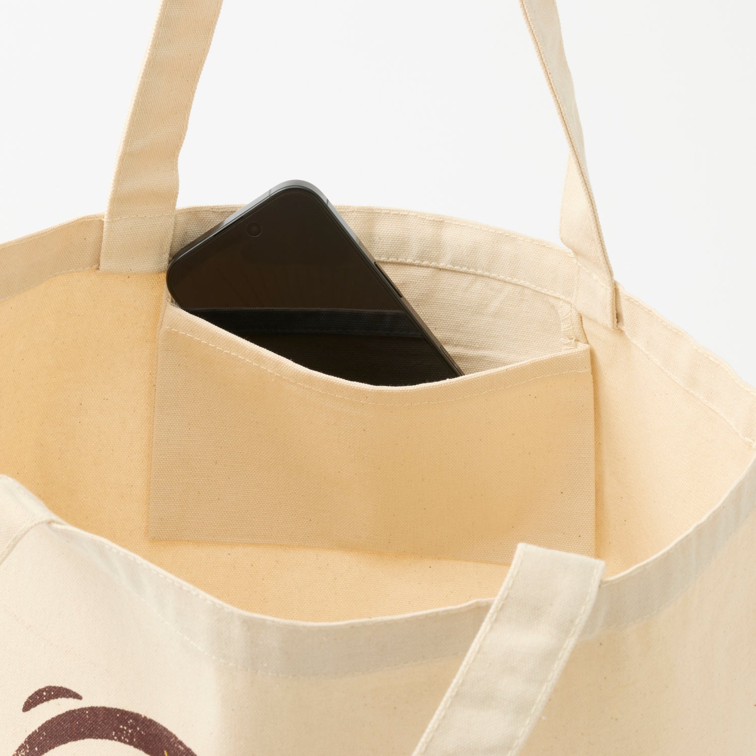 豆から後光が降り注ぐ縁起のいいデザインに仕上げた、A4サイズが横向きにすっぽりと入る大容量トートバッグ。内ポケットとマチが付いた厚手のキャンバス生地で、普段使いや休日のレジャーなど、様々なシーンで活躍します。