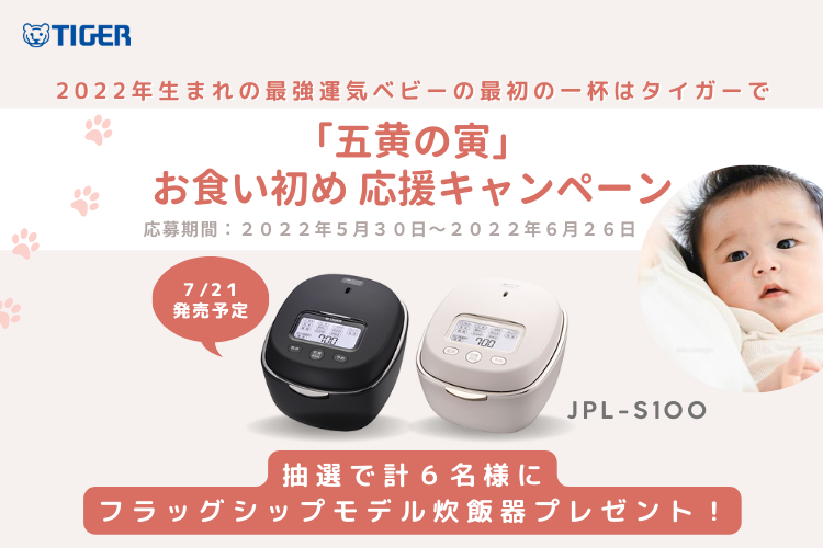 熱制御テクノロジーで世界をリードするタイガー魔法瓶株式会社(社長:菊池嘉聡、本社:大阪府門真市)は、2022年5月30日(月)~6月26日(日)までの期間、2022年寅年生まれのお子様がいらっしゃる方を対象とした、「五黄の寅 お食い初め応援キャンペーン」を公式SNSアカウントにて開催いたします。