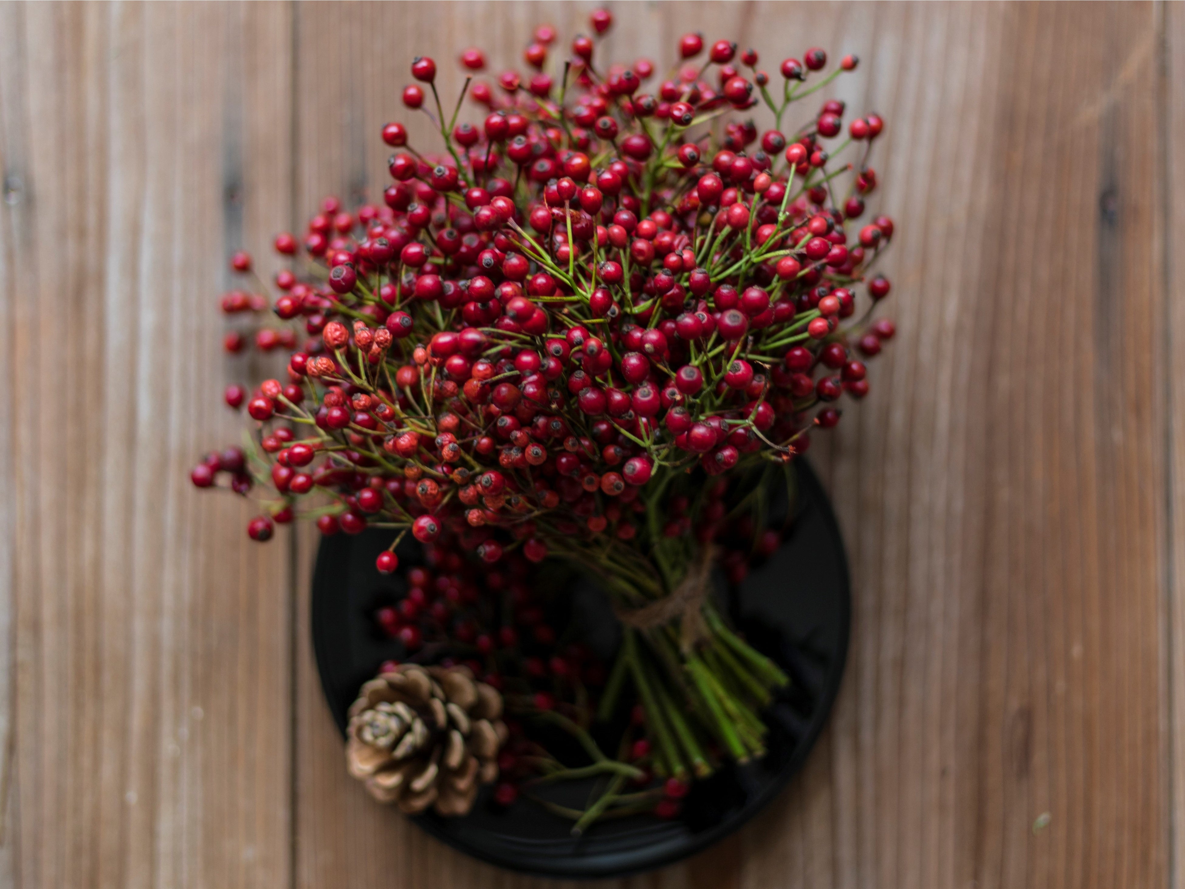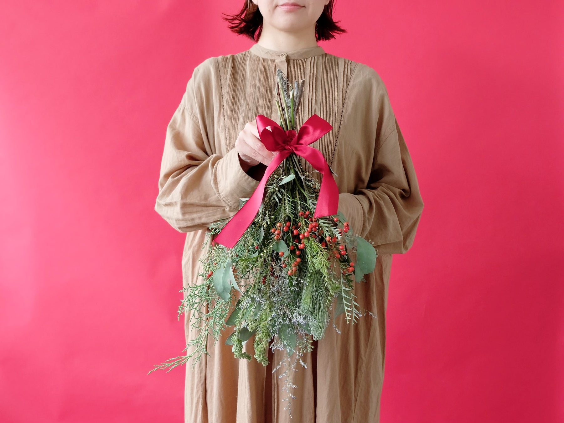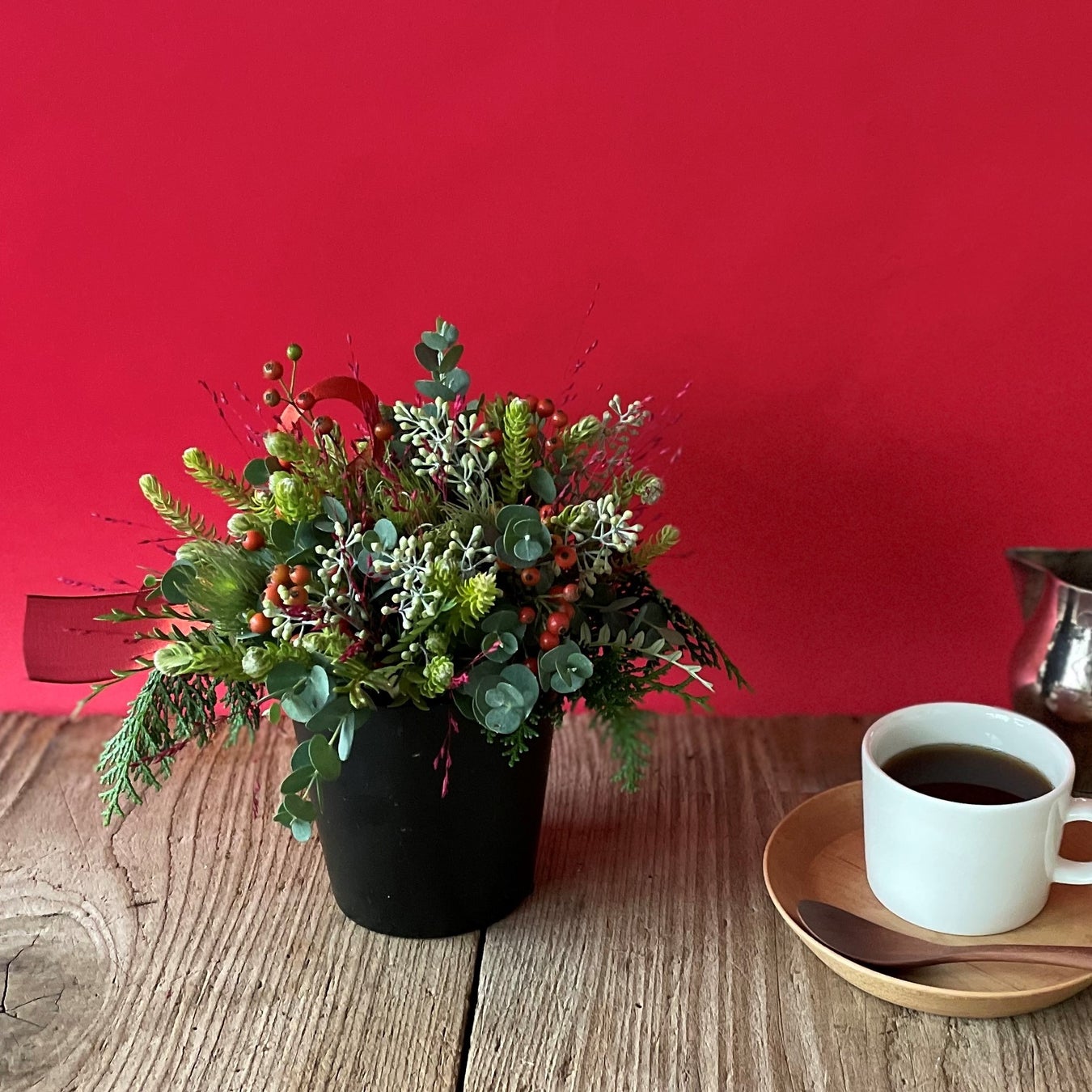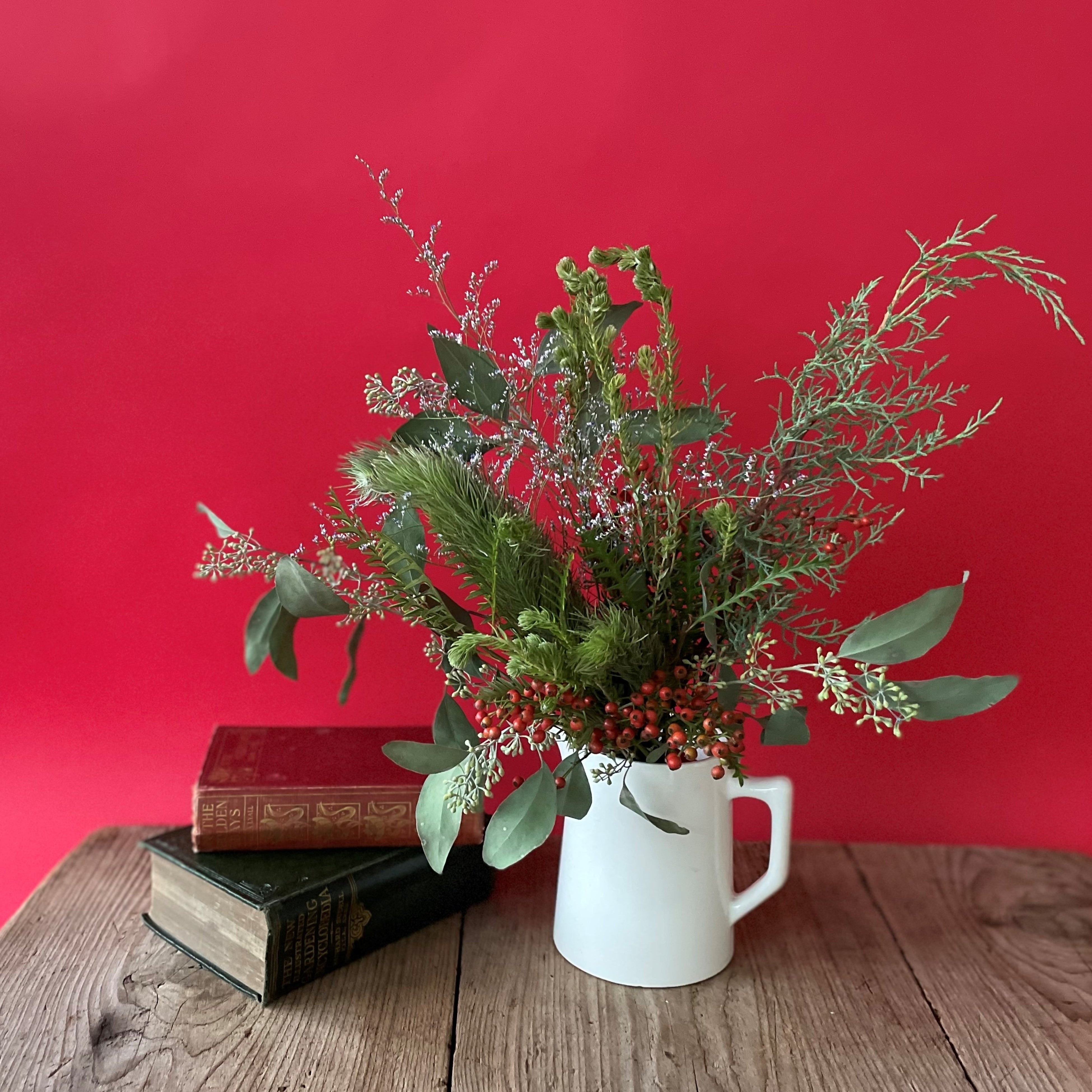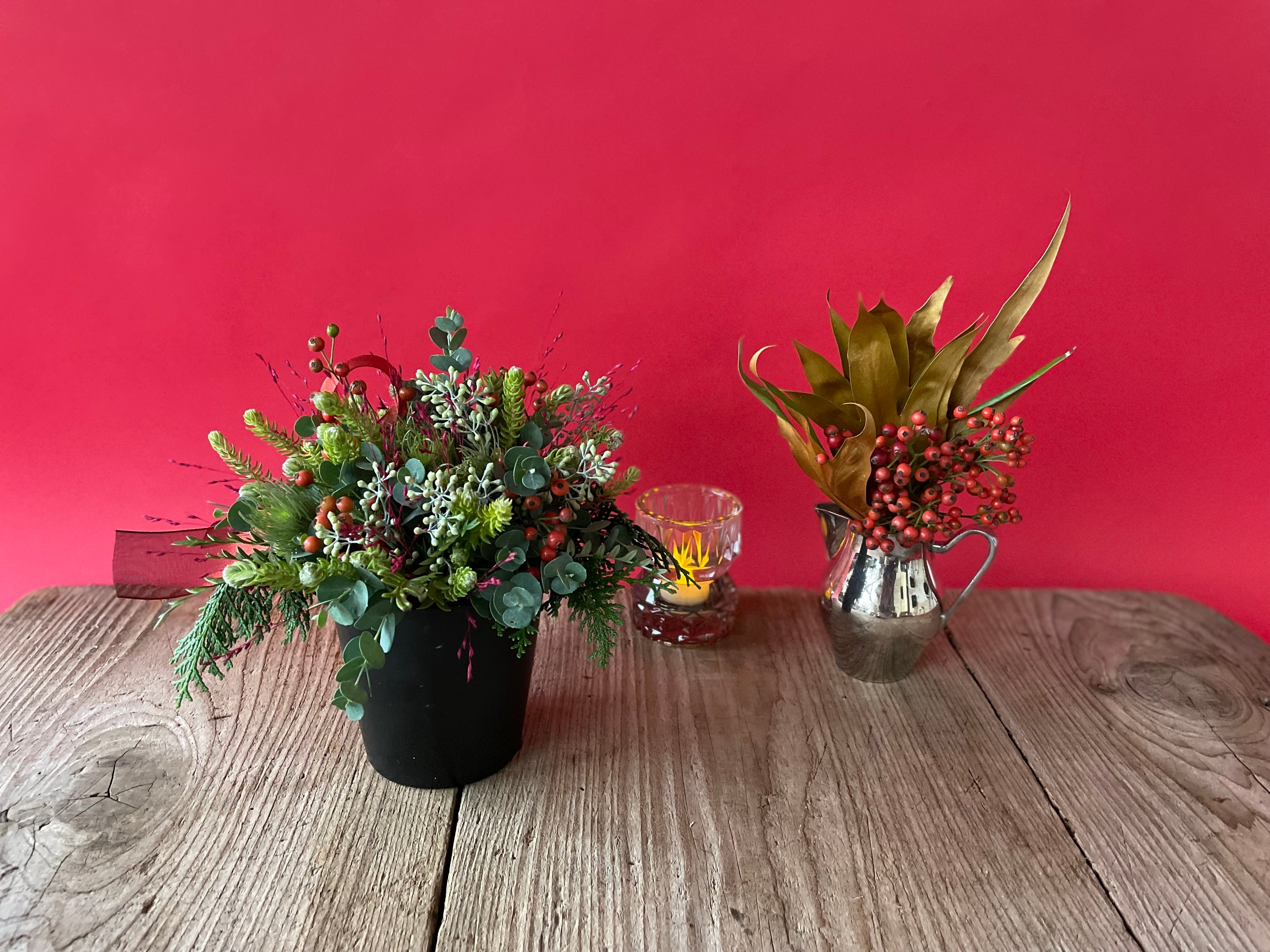 今回は、この時期からクリスマスまでゆっくり時間をかけて変化する姿を楽しんでいただける、たっぷりのグリーンと木の実を使った3つのアイテムをご用意しました。