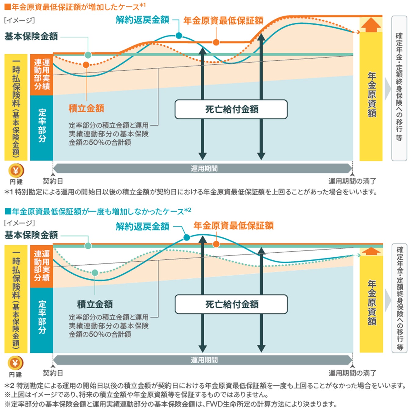 ※年金原資額のうち運用実績連動部分の額は、運用実績連動部分の基本保険金額の50%が最低保証されます。契約日における年金原資最低保証額は、年金支払開始日の前日末の定率部分の積立金額と運用実績連動部分の基本保険金額の50%の合計額となり、一時払保険料(基本保険金額と同額)を下回りません。