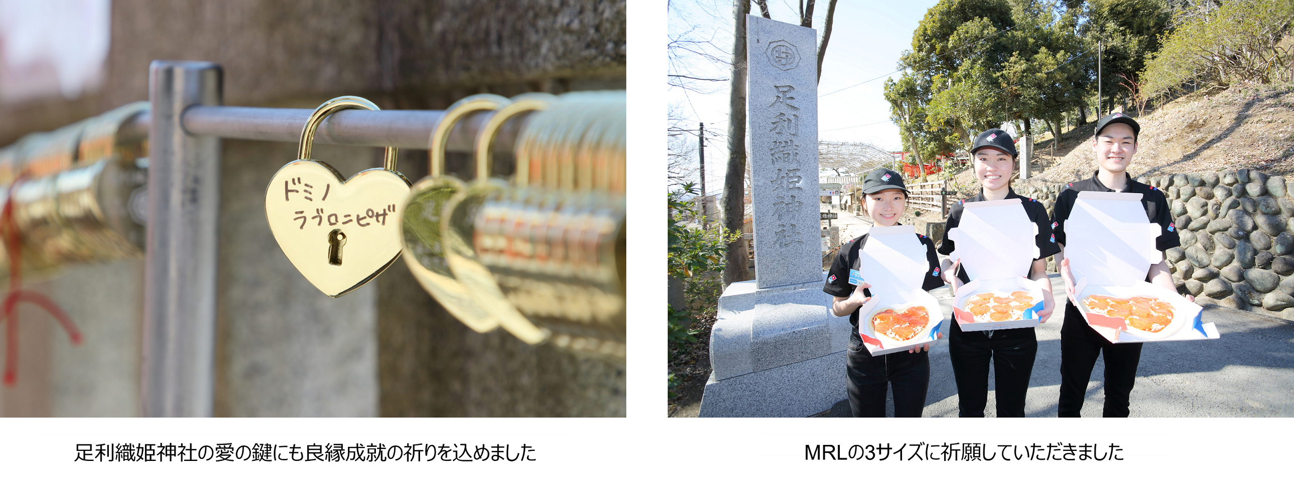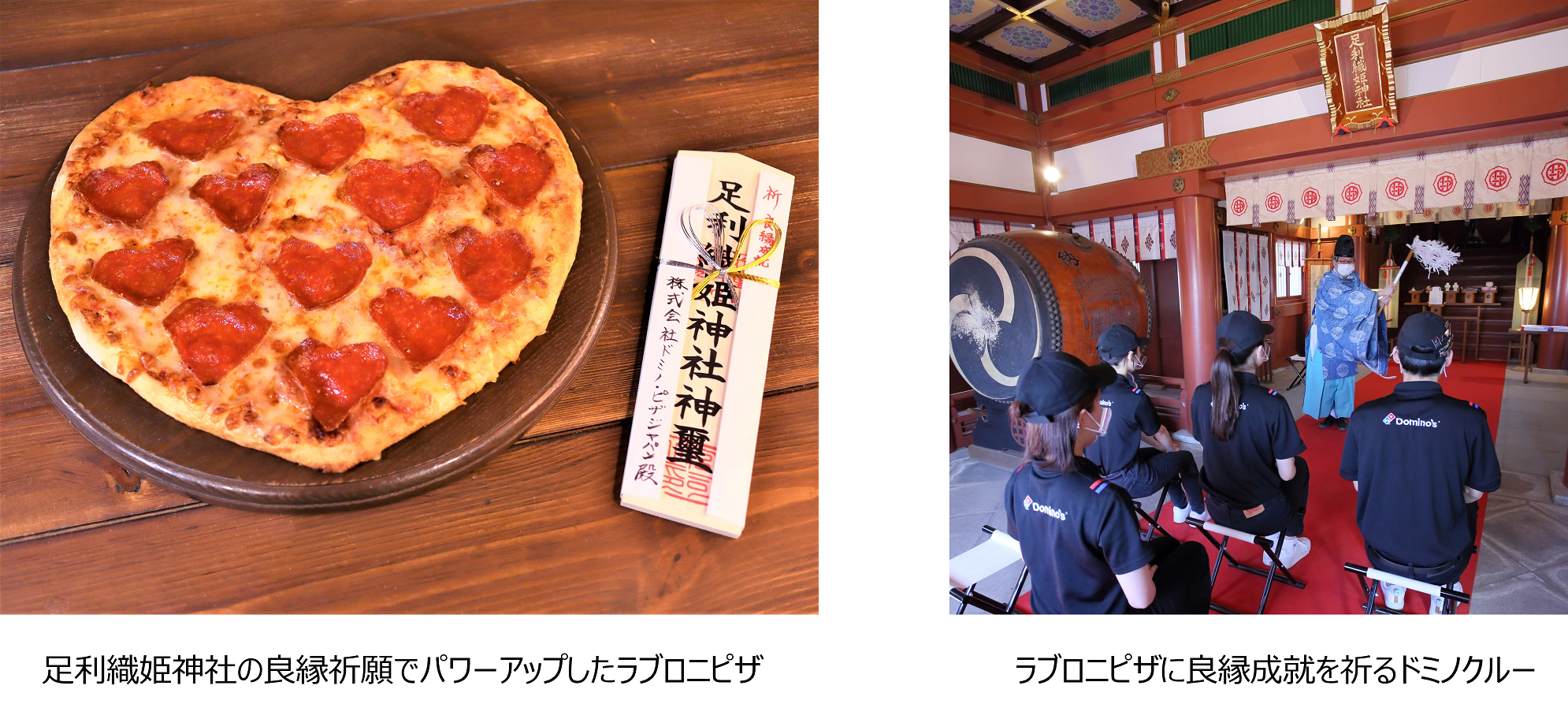 さらに、ドミノ・ピザでは、皆さまの縁結びをお手伝いできないかと考え、コロナ禍で神社への参拝を控えている皆さまの代わりに、「ラブロニピザ」の良縁祈願を行いました。2月3日に、「恋人の聖地」に認定されている足利織姫神社(栃木県足利市)の本殿にて、各サイズの「ラブロニピザ」に向けて、神主様に良縁祈願のご祈祷を行っていただきました。