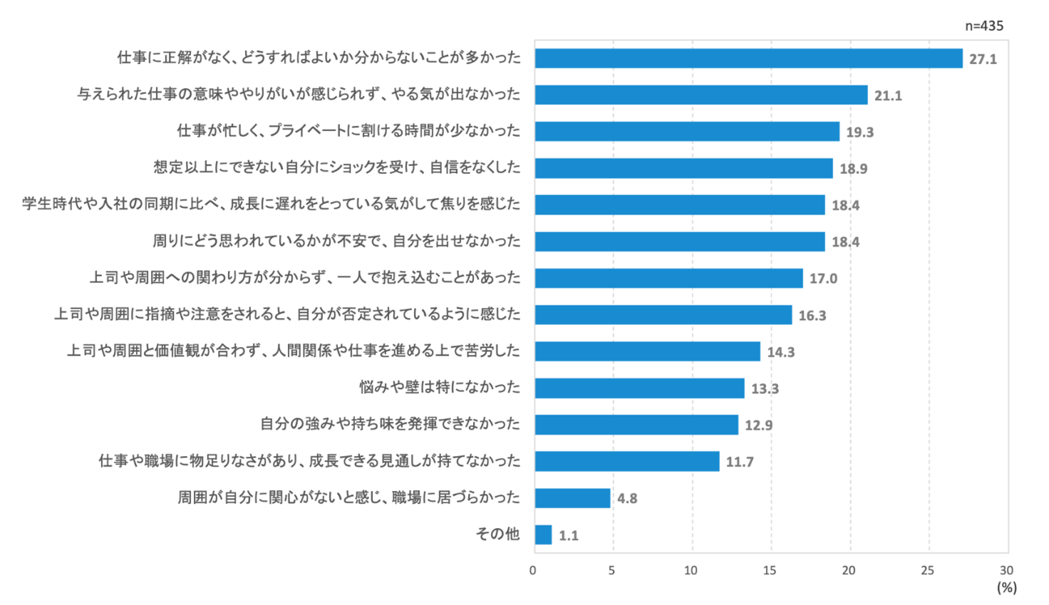 ・入社後1年目の壁について尋ねたところ、「仕事に正解がなく、どうすればよいか分からないことが多かった」(27.1%)、「与えられた仕事の意味ややりがいが感じられず、やる気が出なかった」 (21.1%)、「仕事が忙しく、プライベートに割ける時間が少なかった」(19.3%)が上位だった。