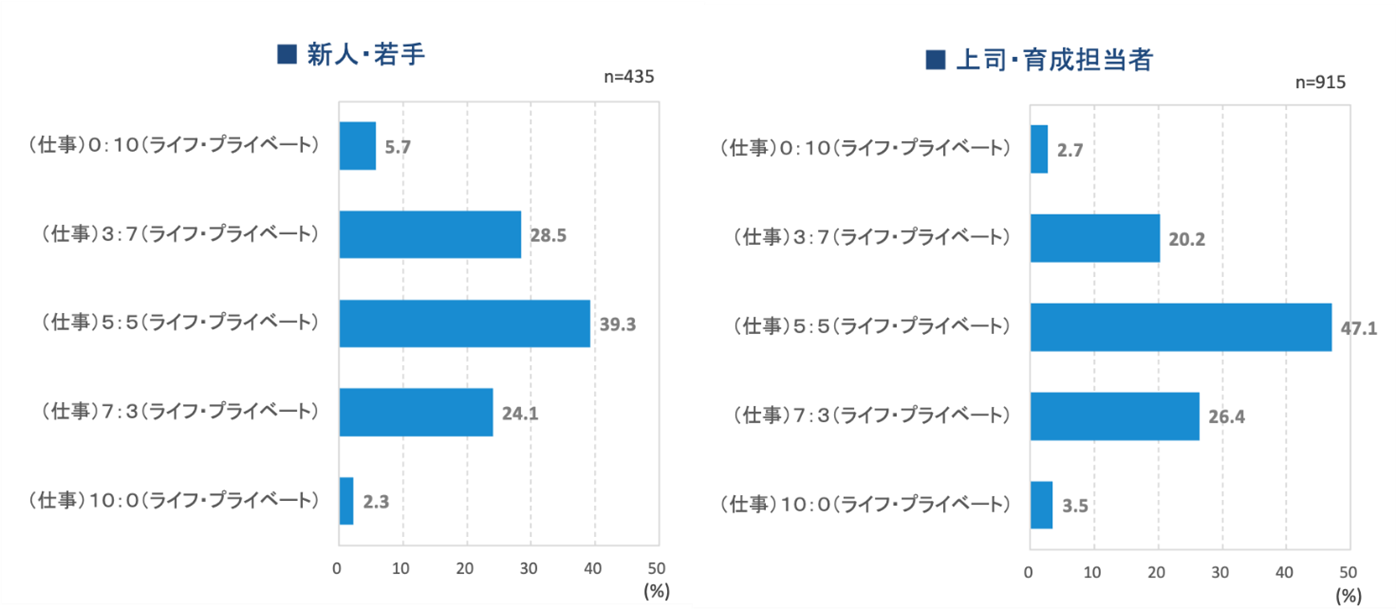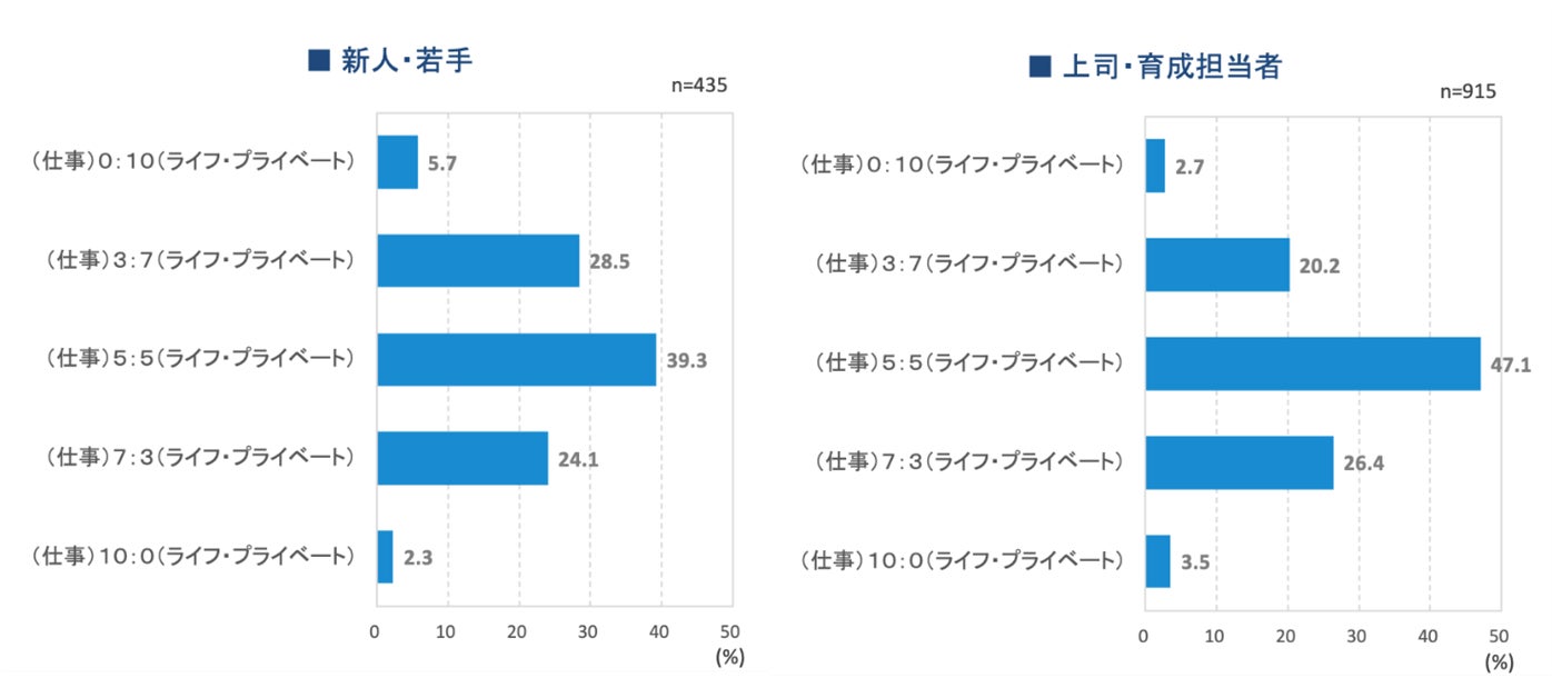 ・仕事とプライベートの理想の割合を尋ねたところ、「仕事0:プライベート10」を選択した割合は新人・若手が5.7%、上司・育成担当者が2.7%、「仕事3:プライベート7」を選択した割合は新人・若手が28.5%、上司・育成担当者が20.2%で、新人・若手の方が相対的に見るとプライベートを重視する傾向がある。