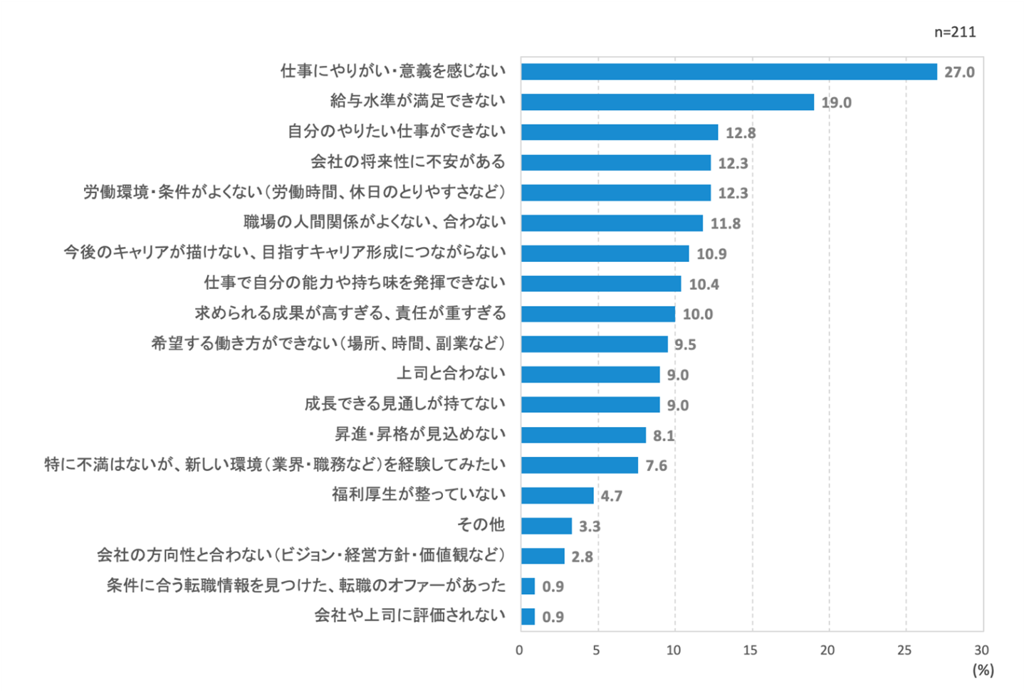 ・会社を辞めたいと思った理由について尋ねたところ、「仕事にやりがい・意義を感じない」(27.0%)、「給与水準が満足できない」(19.0%)、「自分のやりたい仕事ができない」(12.8%)が上位だった。