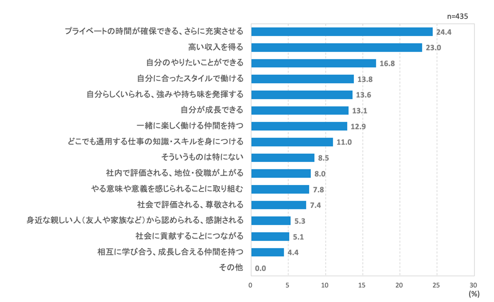 ・労力をかけて得たいものを尋ねたところ、「プライベートの時間が確保できる、さらに充実させる」 (24.4%)、「高い収入を得る」(23.0%)、「自分のやりたいことができる」(16.8%)が上位だった。