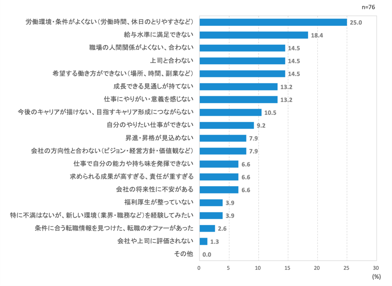 ・図表1で「ある」と回答した方に退職理由を尋ねたところ、「労働環境・条件がよくない(労働時間、休日のとりやすさなど)」(25.0%)、 「給与水準に満足できない」(18.4%) 、「職場の人間関係がよくない、合わない」(14.5%)が上位だった。
