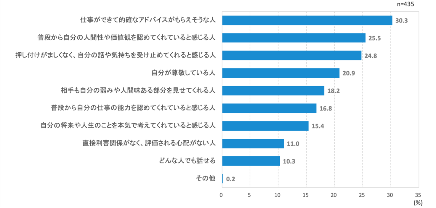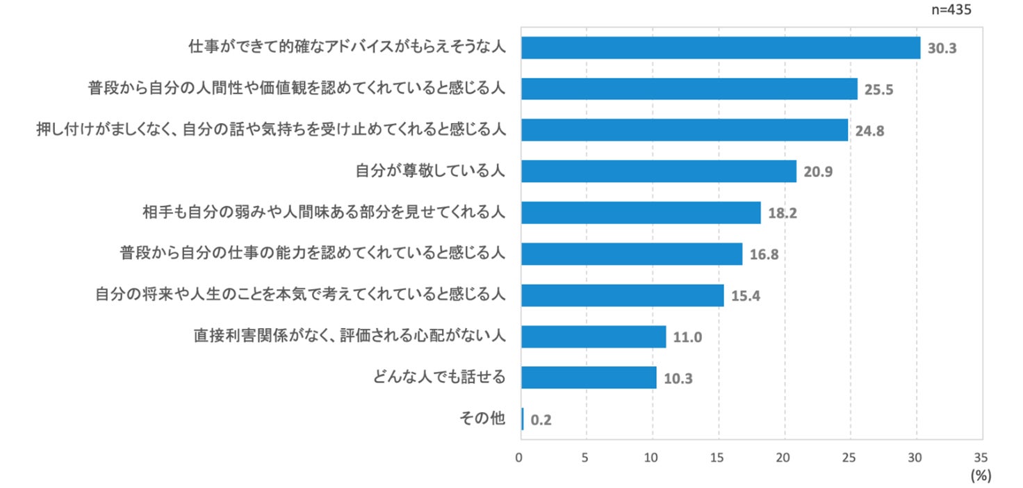 ・悩みを話しやすい上司・先輩像について尋ねたところ、「仕事ができて的確なアドバイスがもらえそうな人」(30.3%)、「普段から自分の人間性や価値観を認めてくれていると感じる人」(25.5%)、「押し付けがましくなく、自分の話や気持ちを受け止めてくれると感じる人」(24.8%)が上位だった。
