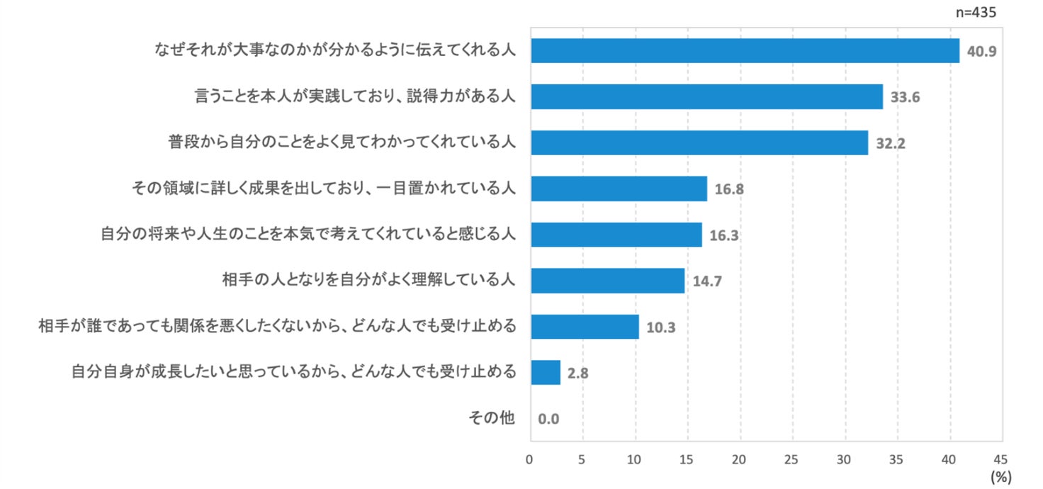 Q:上司や周囲の人について、どんな人だと、自分にとって耳が痛い指摘やフィードバックでも受け止めようと思えますか。あてはまるものを最大2つまでお選びください。