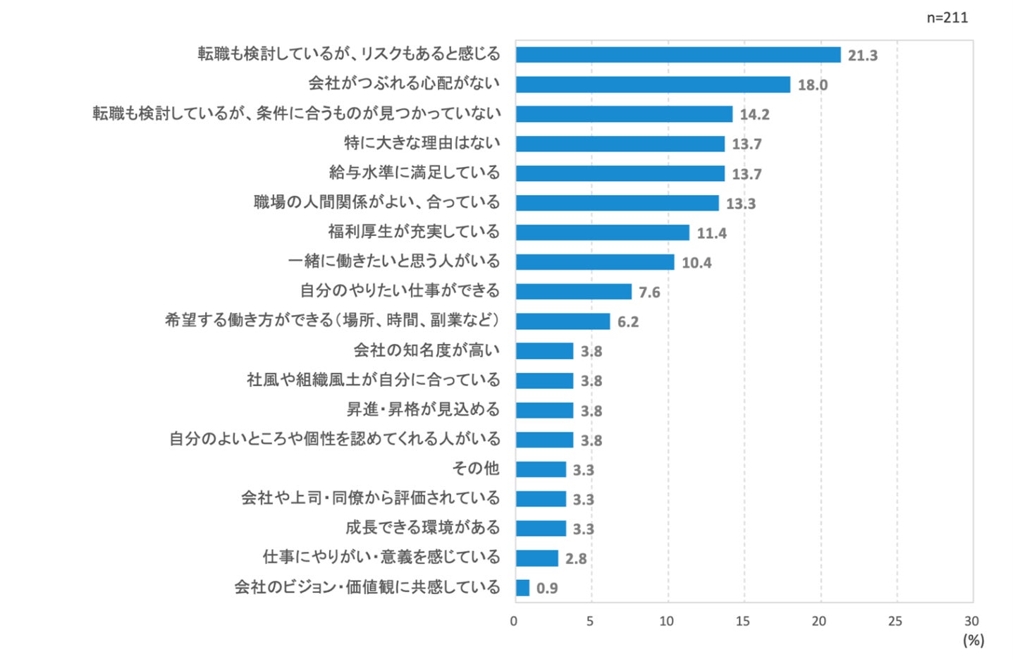 ・ 会社を辞めずに働き続けている理由を尋ねたところ、「転職も検討しているが、リスクもあると感じる」(21.