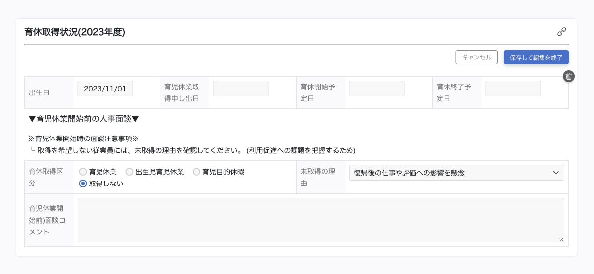 さらに、データの可視化だけに留まらず、改善をサポートする設計になっています。例えば、男性育児休暇取得率の場合、未取得の理由を記載できるようになっています。それを集計してグラフ化することも可能なため、改善施策が検討しやすくなります。