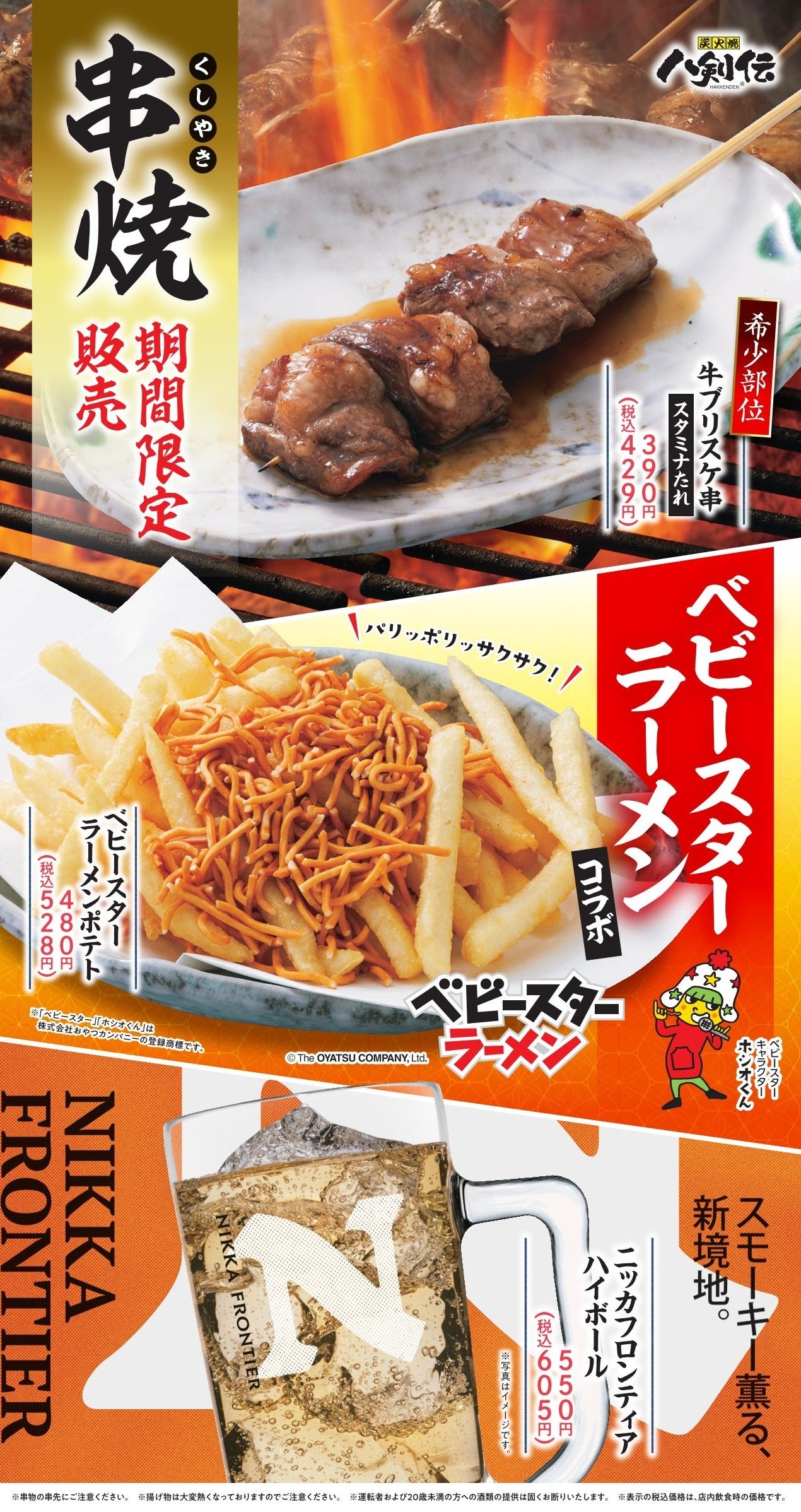 今回のフェアでは、福井県若狭湾の清らかな海で育てたブランド魚「ふくいサーモン」をご用意いたしました。上質な脂のりと、とろけるような口当たりをご堪能いただける「ふくいサーモン刺身」をはじめ、ごま油の香りと塩、ねぎが食欲をそそるメニュー「レバ刺しみたいなサーモン」など、素材の良さを引き出した料理を取り揃えております。また、牛一頭からわずか500gほどしか取れない希少部位を、自慢の炭火で焼き上げた「牛ブリスケ串」や、株式会社おやつカンパニーの人気スナック「ベビースターラーメン」をトッピングした、パリポリ食感が楽しいコラボメニューも登場。スモーキーな薫りが新境地を拓く「ニッカフロンティアハイボール」とともに、至福のひとときを八剣伝でお楽しみください。