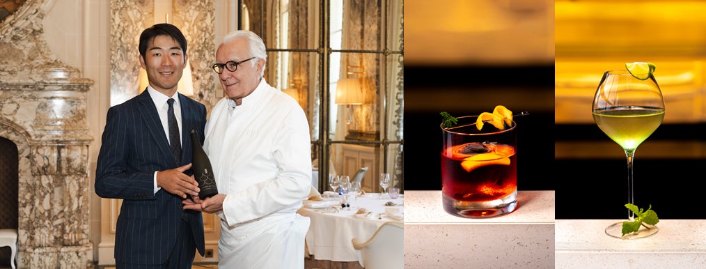 写真左:パリのホテル『ル・ムーリス』で行われたお披露目イベントにて、「七賢」蔵元の北原対馬氏(左)とアラン・デュカス氏(右)、写真右:オリジナル・カクテル(左:07 - トウキョウ ネグローニ 、右:09 - サマー イン キョウト)