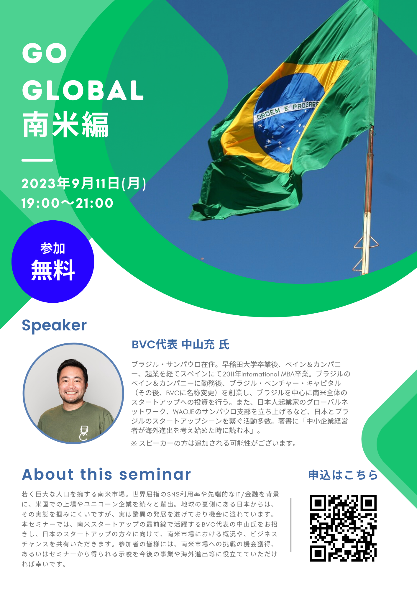 第1回は、2023年9月11日(月)にBVC代表の中山充氏をお招きし、GO GLOBAL 南米編を開催します。参加費無料・事前申込制ですので、お早めにお申込ください。