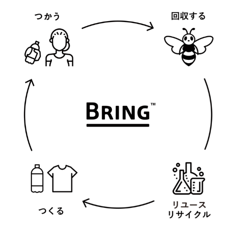BRINGは “あらゆるものを循環させる”サーキュラーエコノミーを社会に実装しています。消費者や企業、自治体と協力し、不要になった服やペットボトル等の回収を行い、リユースや多様なリサイクル技術で原料や新しい製品等の形で市場や消費者にまで再生・循環させ、その循環を軸とした様々なビジネスを行っています。独自の技術で不要となった服のポリエステルやペットボトルを原料に、何度も循環する再生原料を作ることが可能です。