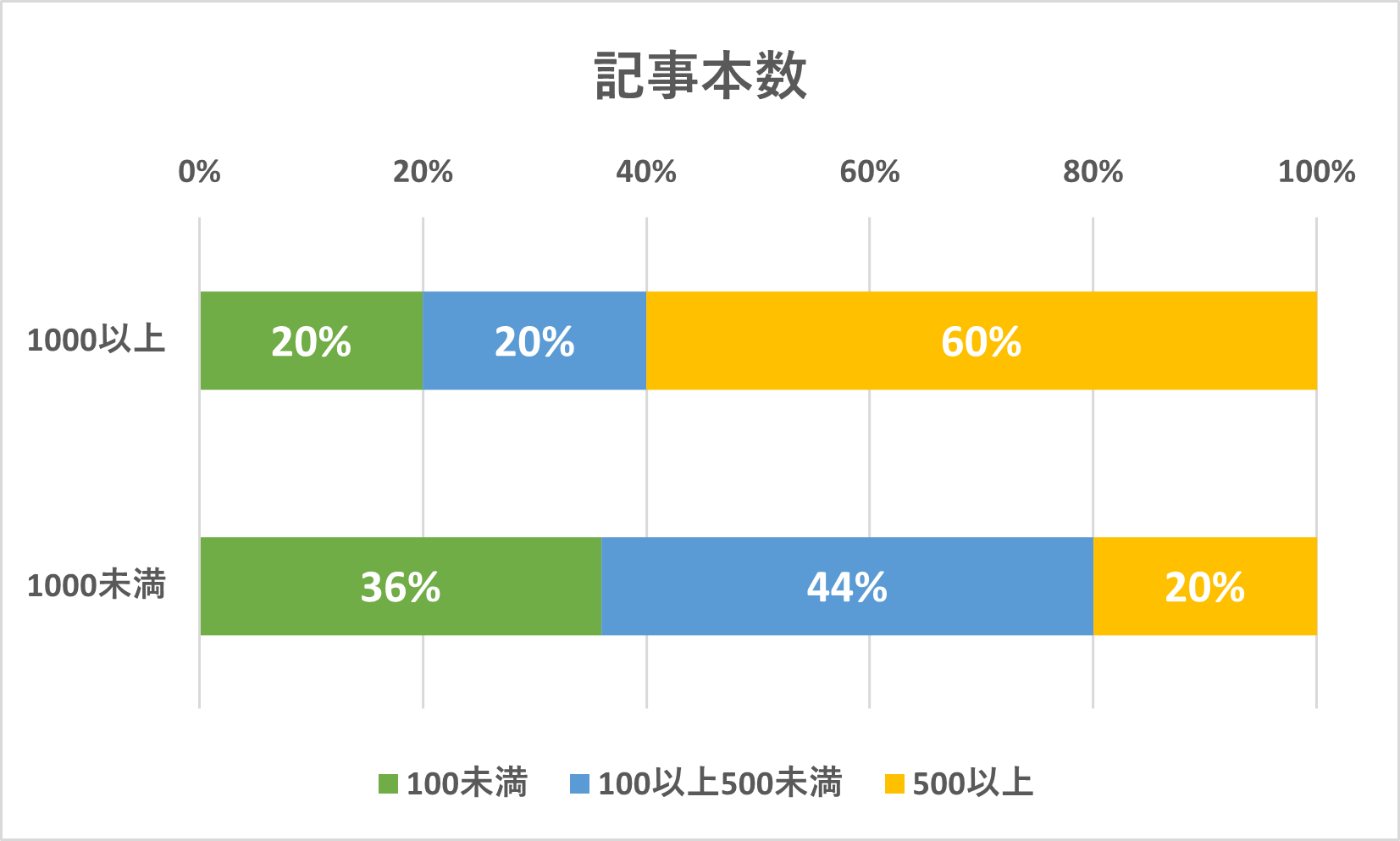 記事本数についてはスコア1,000以上のグループでは6割が「500本以上」であったのに対し、スコア1,000未満のグループでは2割にとどまりました。「多ければ良いというものでもない」という話を普段からしている筆者ですが、やはり「本数」は重要なようです。