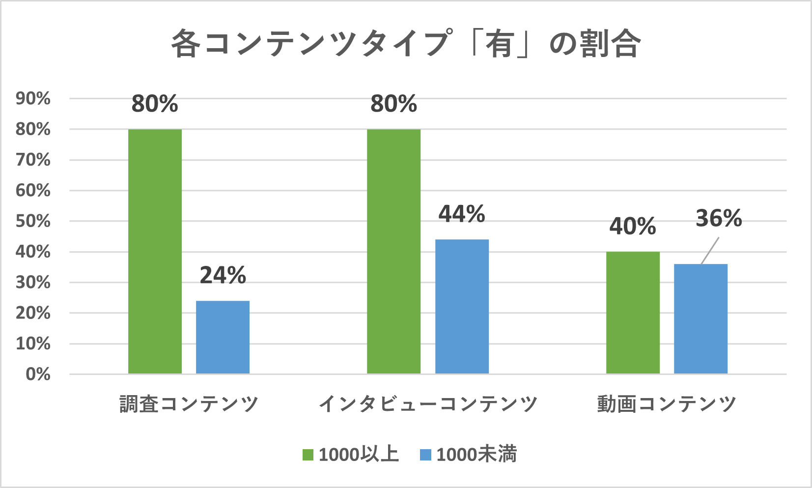 スコア1,000以上のグループは、「調査コンテンツ」や「インタビューコンテンツ」の割合が、スコア1,000未満のグループよりも高くなりました。「動画コンテンツ」については同程度です。こちらも、情報の形式が複数あることで、多様な読者の情報ニーズを満たしているのだと推測できます。