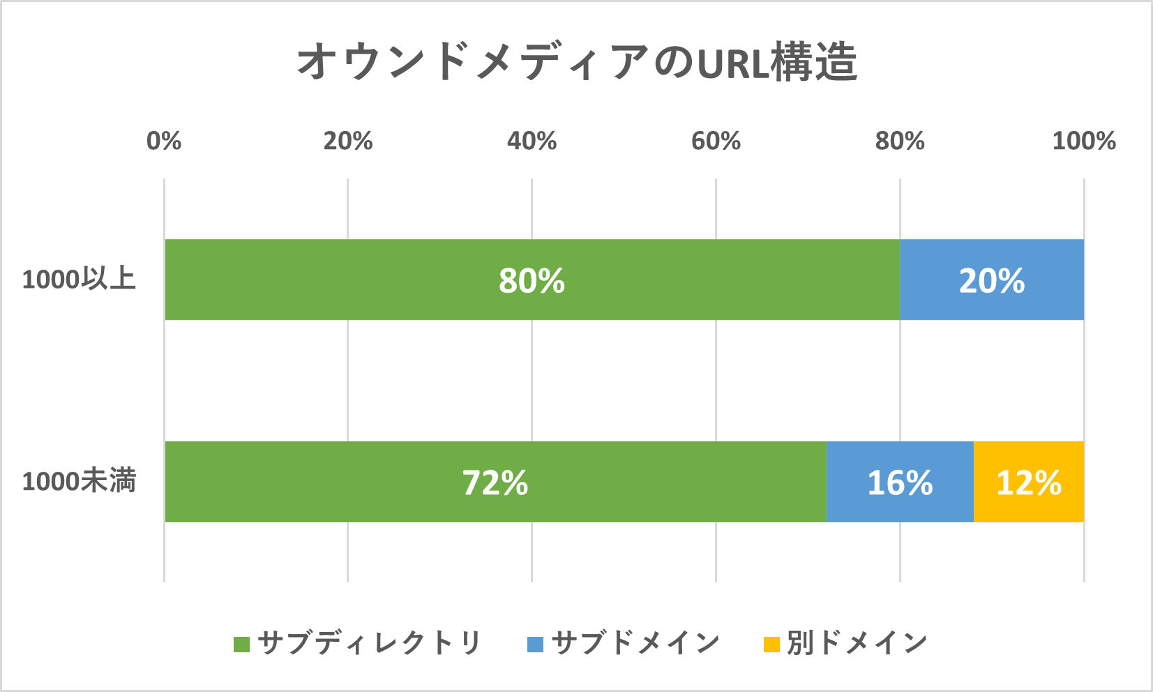 オウンドメディアのURL構造について、スコア1,000以上のグループでは約8割が「サブディレクトリ」であるのに対し、スコア1,000未満のグループでは、約7割にとどまりました。また、スコア1,000未満のグループでは「別ドメイン」も一定割合存在しました。