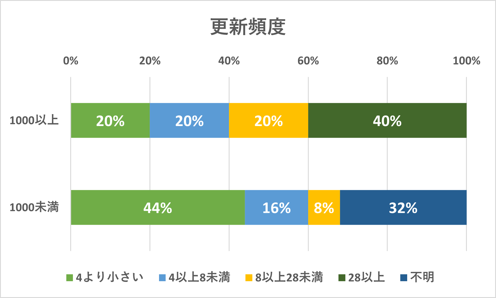 更新頻度については、スコア1,000以上のグループでは「月間28本以上」という割合が4割と最も多くなりました。いっぽう、スコア1,000未満のグループでは「4より小さい」が約4割を占めました。更新頻度は上述の本数とも密接に関わってきますね。リソース的に可能なら、更新頻度を上げることは成果につながるといえそうです。