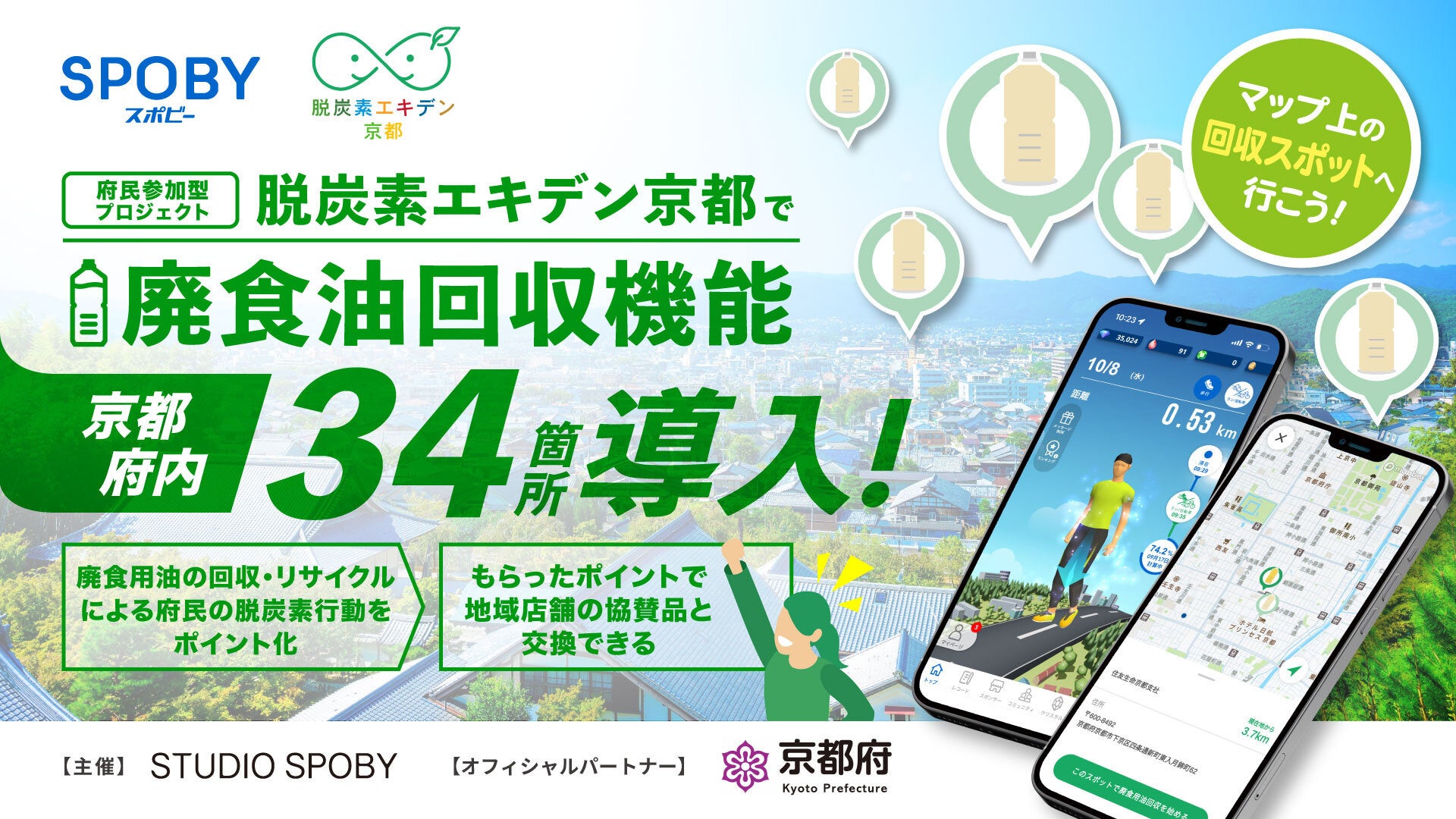 株式会社スタジオスポビー(東京都中央区、代表取締役 夏目恭行、以下「当社」)は、京都府と連携した共同脱炭素プロジェクト「脱炭素エキデン京都」において、家庭から出る廃食用油を回収しポイント化する「廃食油回収機能」を、京都府内34箇所にて実装開始いたしました。