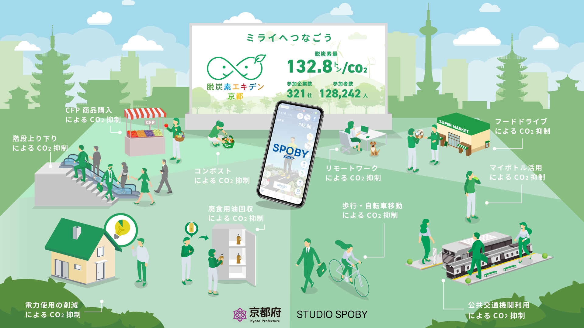 実施概要:参加する民間企業の従業員や府民の皆様に、エコライフアプリ「SPOBY(スポビー)」を使用いただき、個人脱炭素推進による脱炭素 社会の実現を目指します。