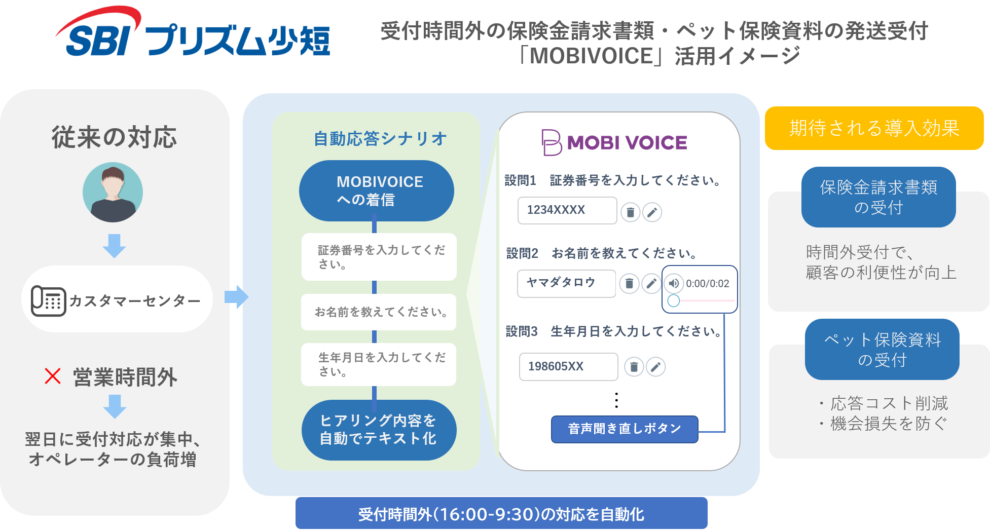 SBIプリズム少額短期保険にAI電話自動応答システム「MOBI VOICE」を導入、受付時間外でも保険金請求書類や資料請求発送受付が可能に