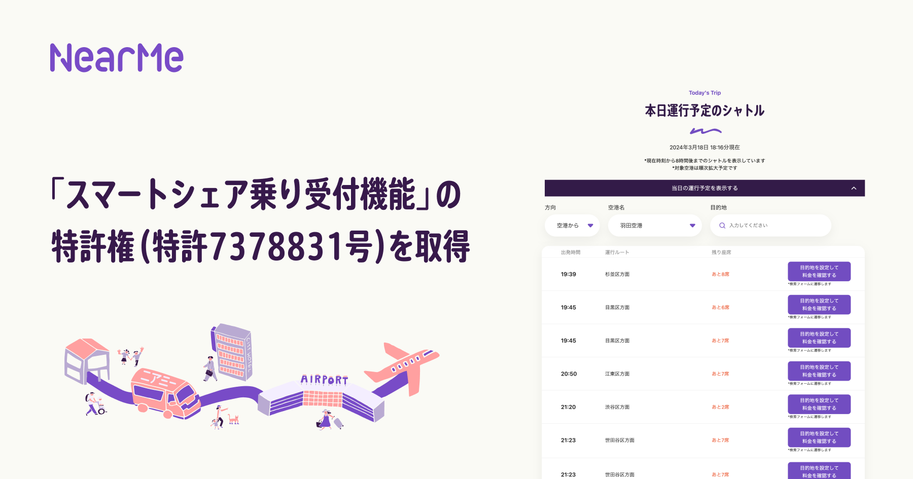 「NearMe」は、独自のAIを活用した最適なルーティングで、出発地から目的地までの移動をドアツードアで結ぶタクシーのシェアサービスとして、空港とその周辺の都市部を結ぶ空港送迎型の『エアポートシャトル』等を展開し、延べ利用者数は2024年8月時点で85万人を超えています。ニアミーでは、多くの“シェア乗り”マッチングを成立させることができるシステムの開発に取り組む中で「スマートシェア乗り受付機能」を開発し、特許を取得いたしました。本特許は、1組目の運行が開始するまでの直前のご予約でも“シェア乗り”を成立させることを可能とし、『エアポートシャトル』をはじめ『シェア乗りタクシー』『ゴルフシャトル』など「NearMe」が提供するサービスすべてにおいて利用することができます。