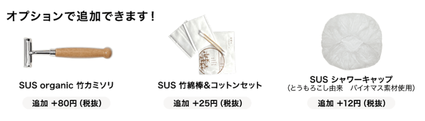 | アメニティ追加オプション | ・SUS organic竹カミソリ / +80円(税抜) ・SUS organic竹綿棒&コットンセット / +25円(税抜) ・SUS バイオマス素材シャワーキャップ / +12円(税抜) |