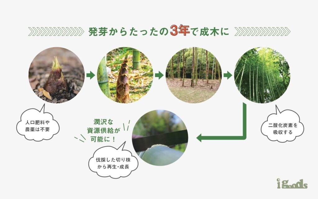 竹は栽培の際に人工肥料や農薬を必要とせず、発芽してからたったの3年で成木になります。成長期には一晩で一メートル以上も成長する生命力に溢れた植物です。また、伐採した切り株から新たに再生・成長するため買い替えが必要なく、土壌への負担もかかりません。
