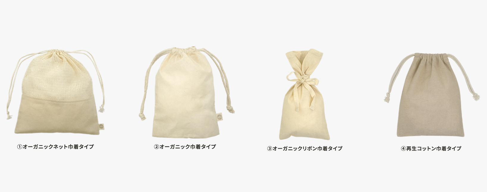 | 巾着 素材 | ①オーガニックネット巾着タイプ:オーガニックコットン ②オーガニック巾着タイプ:オーガニックコットン ③オーガニックリボン 巾着タイプ:オーガニックコットン ④再生コットン巾着タイプ:リサイクルコットン |