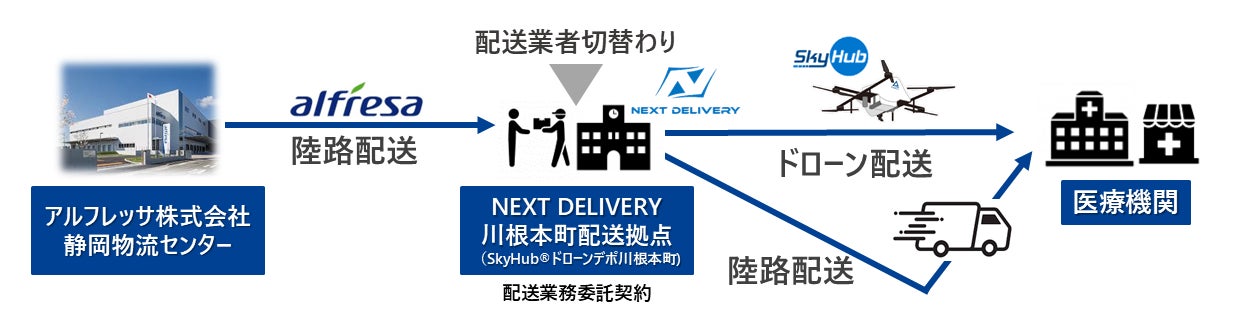 ドローンを活用した新スマート物流※1実装事業を2024年度から2026年度までの3年間の計画で実施している静岡県川根本町において、アルフレッサ ホールディングス株式会社の子会社であるアルフレッサ株式会社(本社:東京都千代田区、代表取締役社長:福神雄介、以下「アルフレッサ」)と株式会社エアロネクスト(本部所在地:東京都渋谷区、代表取締役CEO:田路圭輔、以下「エアロネクスト」)、エアロネクストの子会社である株式会社NEXT DELIVERY(本社:山梨県小菅村、代表取締役:田路圭輔、以下「NEXT DELIVERY」)は、災害時の医薬品配送を見据え、「ドローンによる医薬品配送に関するガイドライン」※2に準拠し、フェーズフリー※3の考え方に基づいたドローンを活用した医療機関への医薬品の定期配送を2025年4月22日から開始しました。