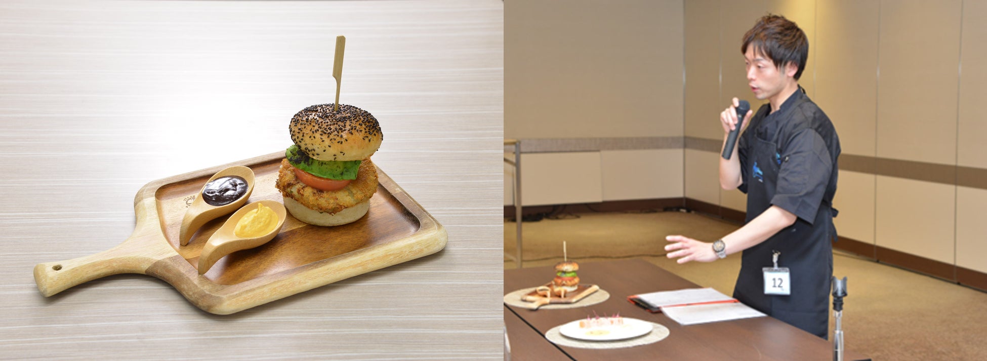 「優勝できたことを非常に嬉しく思います。様々な食材の組み合わせによって発見溢れる料理の提供を心がけており、今回はビーフを超える美味しさを野菜で表現したいという思いが優勝に繋がったと思っています。ジャガイモをパティ代わりに、ナスで肉汁を表現し、味噌田楽をアレンジしたソースを使うことで、個性あるベジタブルバーガーに仕上げました。今後はさらなる高みを目指し、本コンテストにチャレンジした自分の姿を見せ、チームの士気を高めることが目標です」