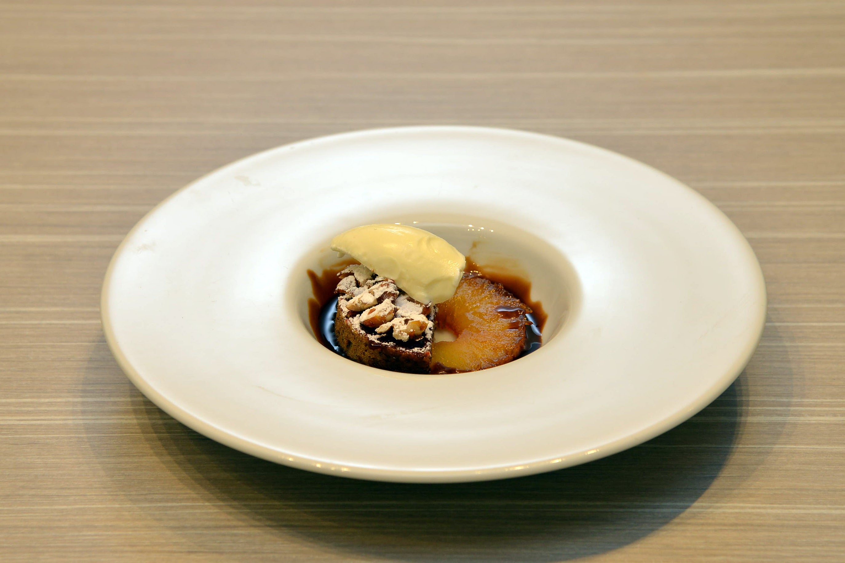 「ヒルトン名古屋で人気のあるスイーツビュッフェのライブ感を大切にした、プレゼンテーションを評価いただけて、とても嬉しく思っています。今回の作品は、焼いたパイナップルに冷たいアイスクリームを乗せ、温かいソースをかけてお召し上がりいただくスタイルに仕上げました。酸味と甘み、そしてソースの絶妙なマリアージュをお楽しみいただければ幸いです」