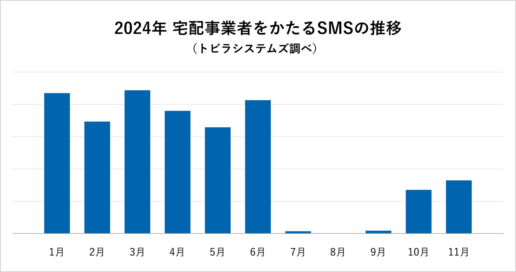 2024年は宅配事業者をかたるSMSが7月から9月にかけて急激に減少する動きがみられました。10月以降は、上半期より件数が減少したものの、再び継続的に発生しています。