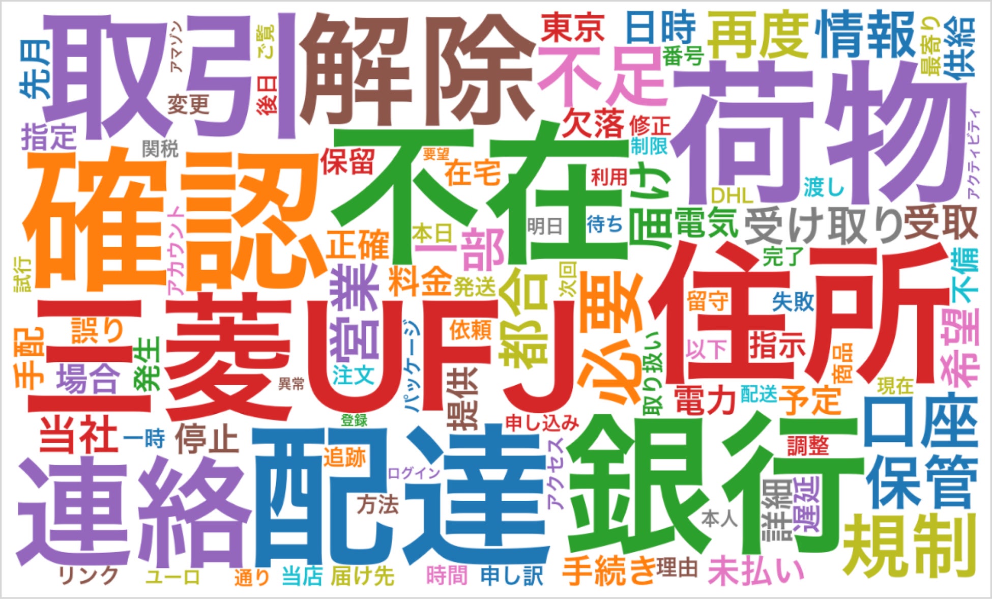 ワードマップに登場する単語は、トビラシステムズの調査において、2024年にスミッシングの文面で頻出した単語です。文面に多く使われた単語ほど、大きく表示されています。