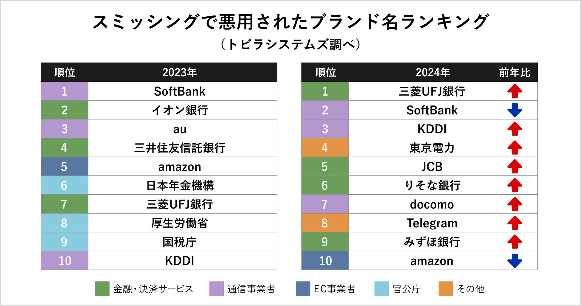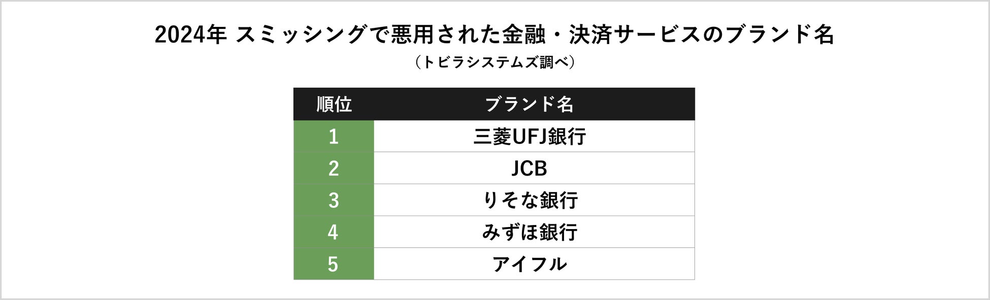 2024年にスミッシングで悪用されたブランド名は、1位から順に「三菱UFJ銀行」「SoftBank」「KDDI」となりました。2024年は金融機関のブランド名の悪用が目立ち、1位の「三菱UFJ銀行」のほか、「JCB」「りそな銀行」「みずほ銀行」が上位に入りました。