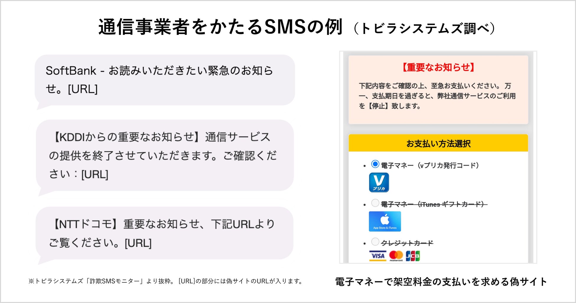 通信事業者をかたる手口では、「SoftBank」「KDDI」「docomo」などをかたり、重要なお知らせや緊急性の高い通知を装い、SMS内のリンクにアクセスさせて偽サイトに誘導します。偽サイトで個人情報を盗み取るフィッシング詐欺のほか、架空の未納料金支払いを求める偽サイトに誘導し、プリペイドカード等を購入させて金をだまし取る架空料金請求型の手口も多発しています。