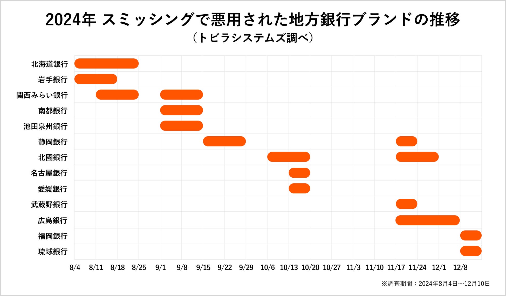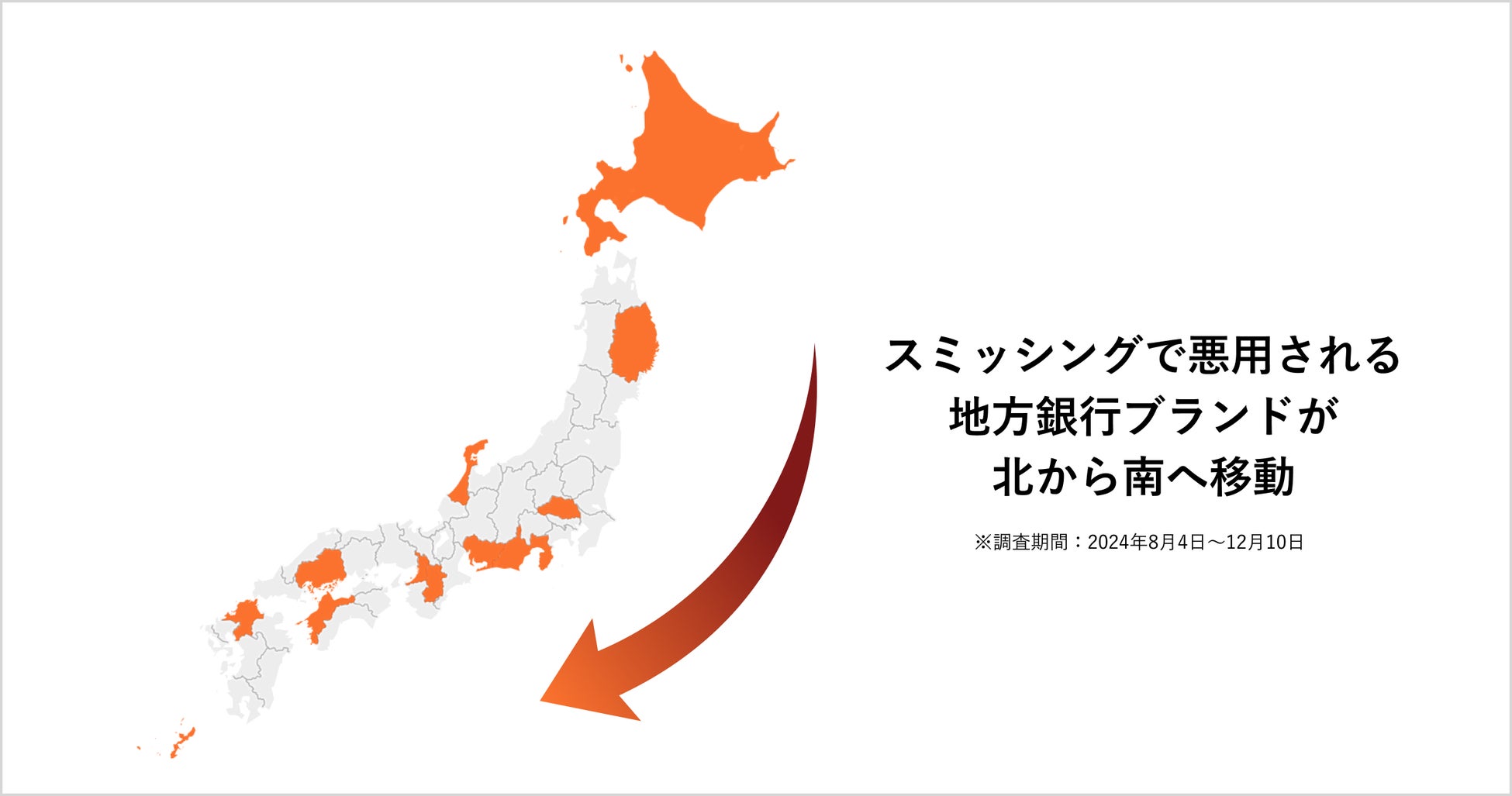 また、2024年8月から時期を追うにつれて、スミッシングで悪用される地方銀行のブランド名が北から南へ移動していく傾向がみられました。犯行グループが時期によってブランド名を使い分けることで、各地域の地方銀行ユーザーを狙っている可能性が考えられます。