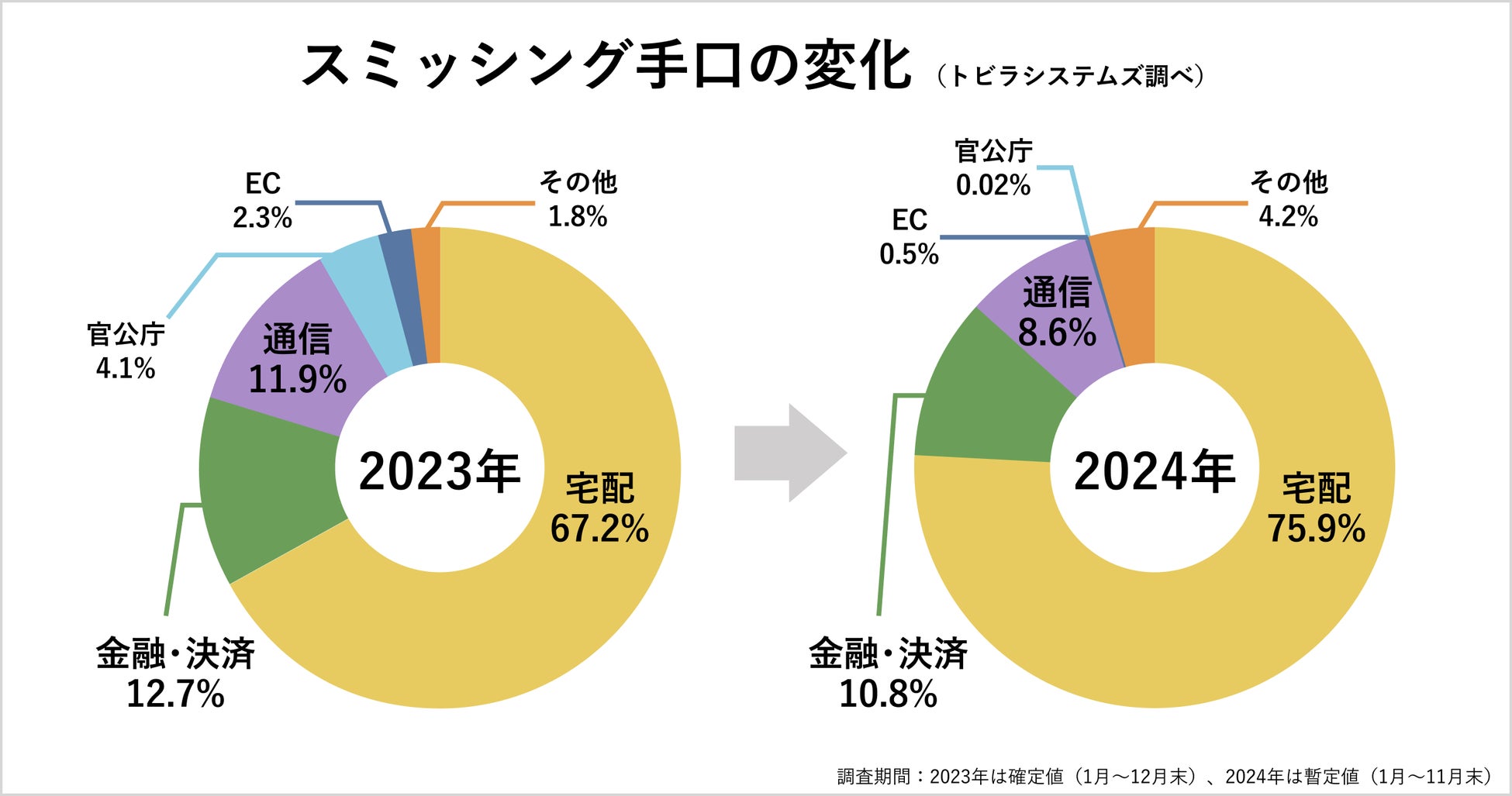 特殊詐欺やフィッシング詐欺の対策サービスを提供するトビラシステムズ株式会社(本社:愛知県名古屋市、代表取締役社長:明田 篤、証券コード:4441、以下「トビラシステムズ」)は、独自の迷惑情報データベースをもとに、昨今増加するSMSを悪用したフィッシング詐欺「スミッシング」について調査し、2024年に流行した手口の傾向をまとめた「スミッシングトレンドレポート2024」を公開します。