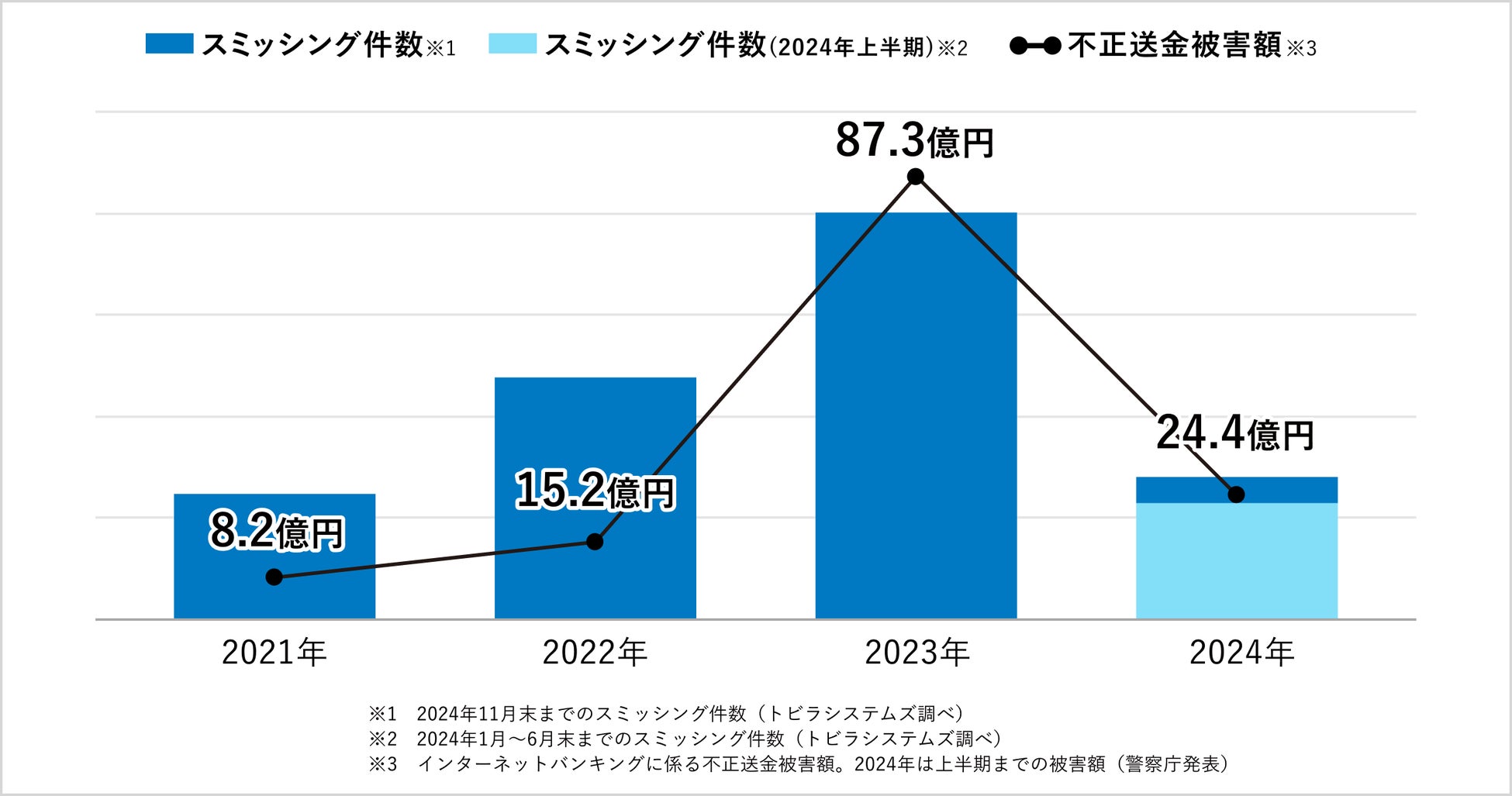 近年、フィッシング詐欺で盗み取られたアカウント情報やクレジットカード情報などが悪用され、インターネットバンキングに係る不正送金やクレジットカードの不正利用などの被害が社会問題となっています。警察庁の発表では、2023年のインターネットバンキングに係る不正送金被害額は87.3億円まで急増し、2024年は上半期で24.4億円に上っています。トビラシステムズの調査では、スミッシングの発生件数に連動して、インターネットバンキングに係る不正送金被害額が増減する傾向がみられています。