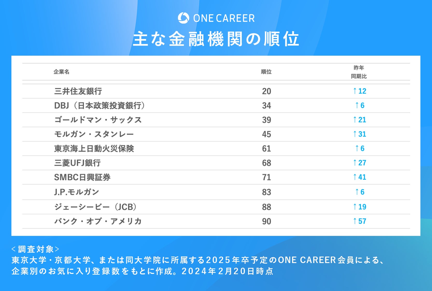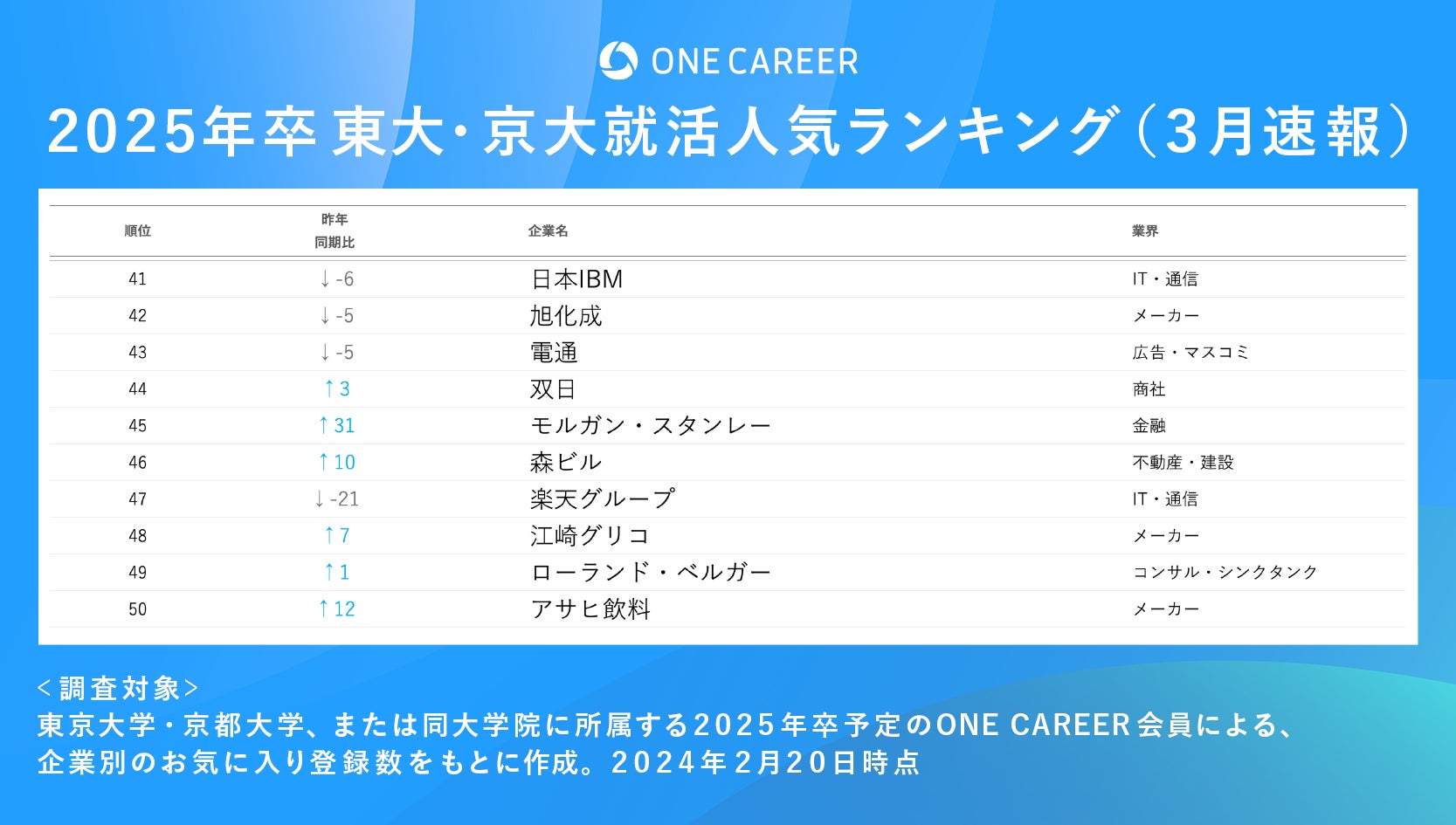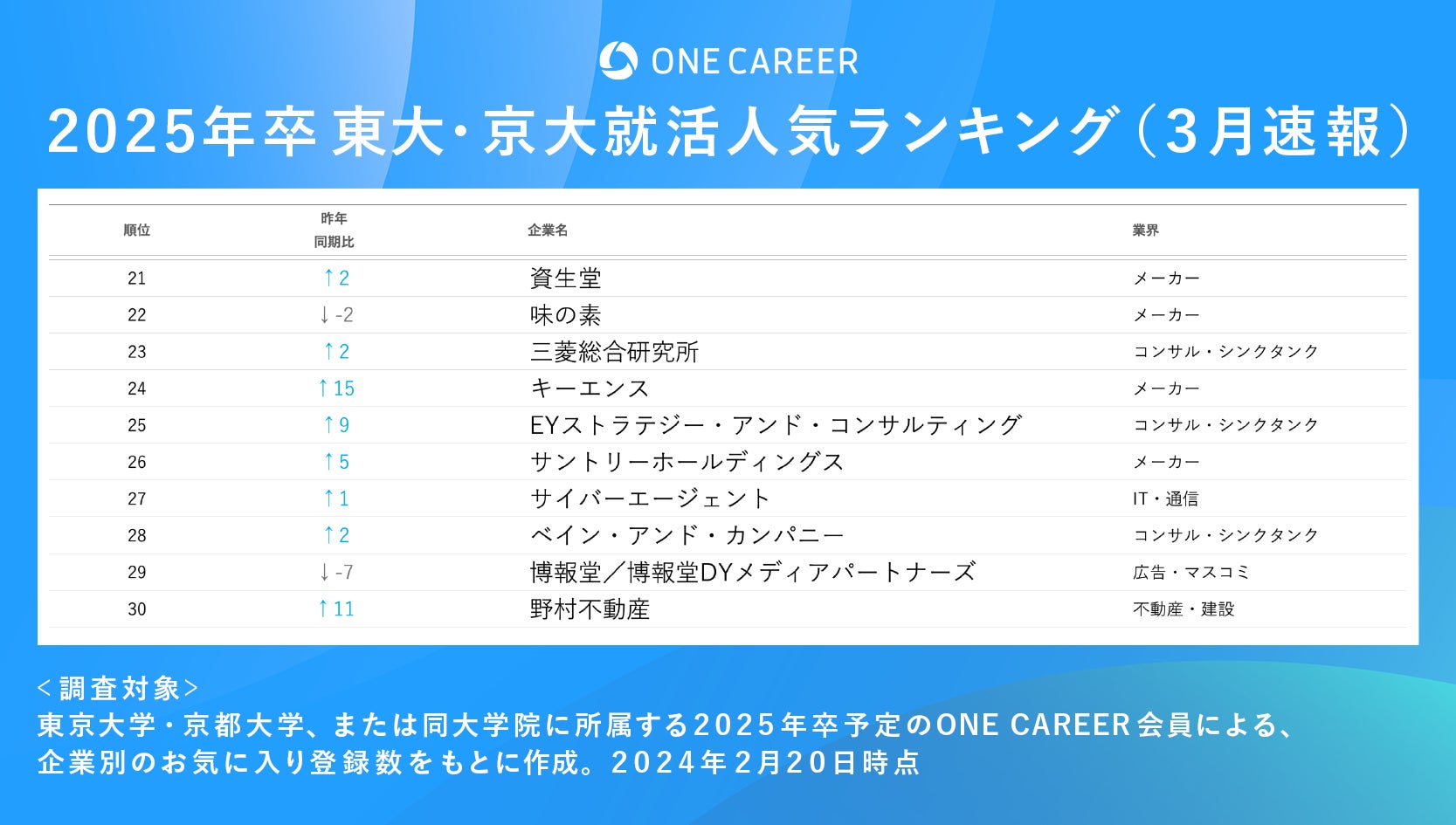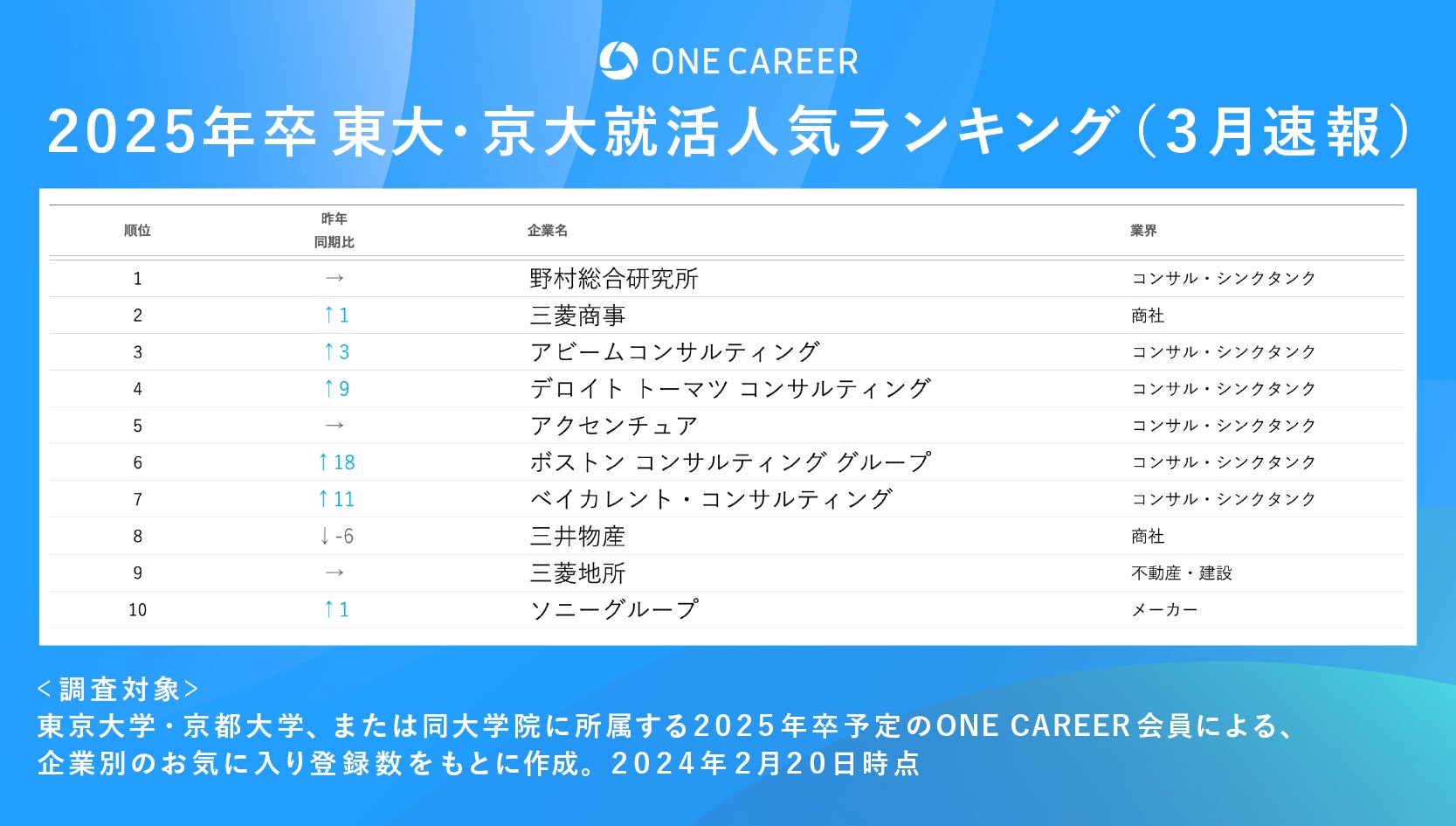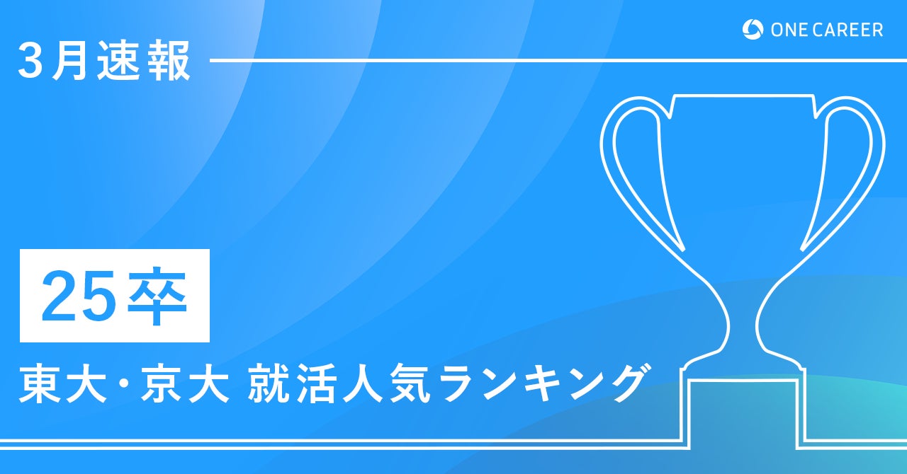 はじめてのキャリアを選ぶ、就活サイト「ONE CAREER」を運営する株式会社ワンキャリア(本社:東京都渋谷区、代表取締役社長 宮下尚之、以下ワンキャリア)は、「東大・京大25卒就活人気ランキング 3月速報」を発表いたしました。